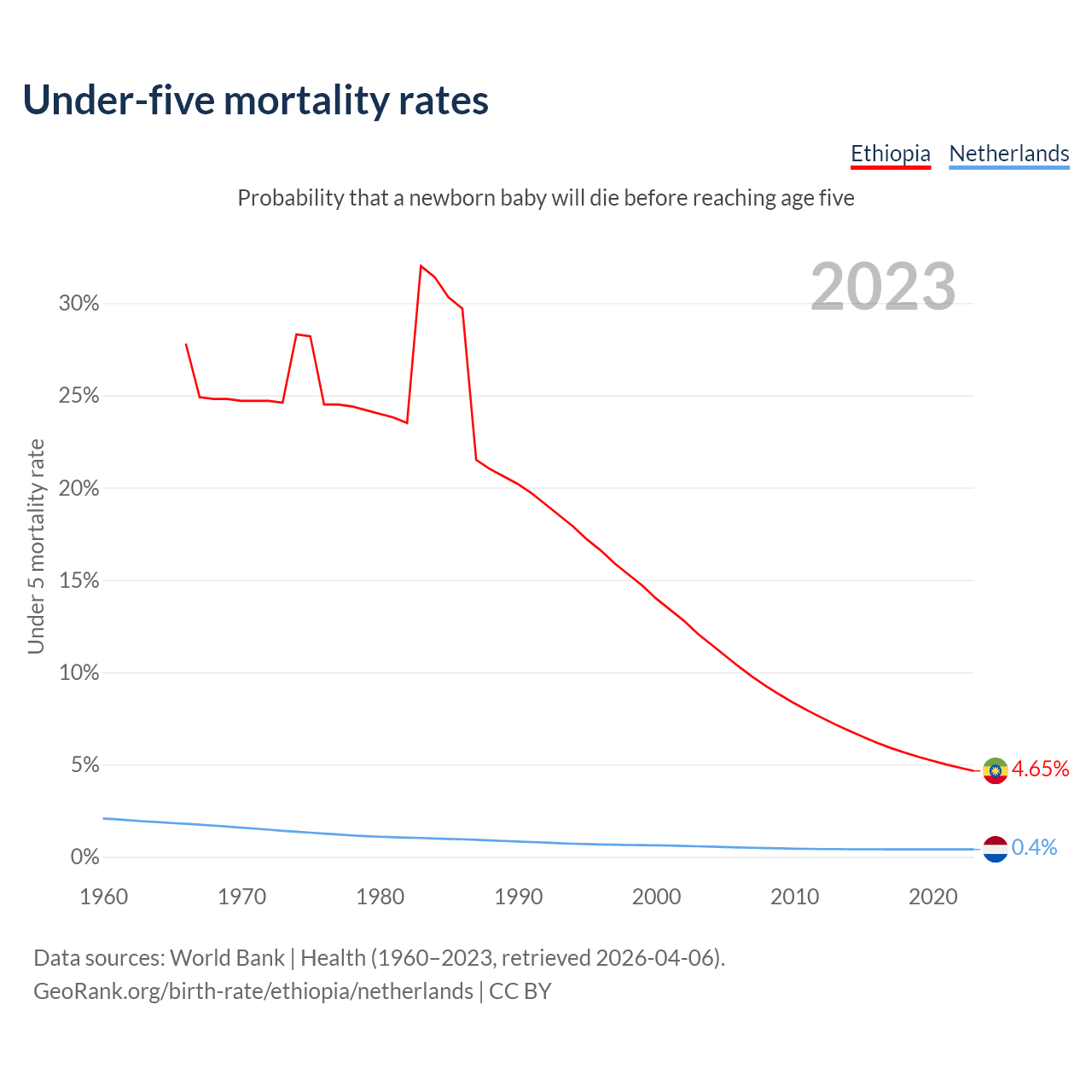 The chance that a newborn baby will die before reaching age five is 4.65% in Ethiopia and 0.4% in the Netherlands. Above is a chart with historical data on under-five mortality rates.