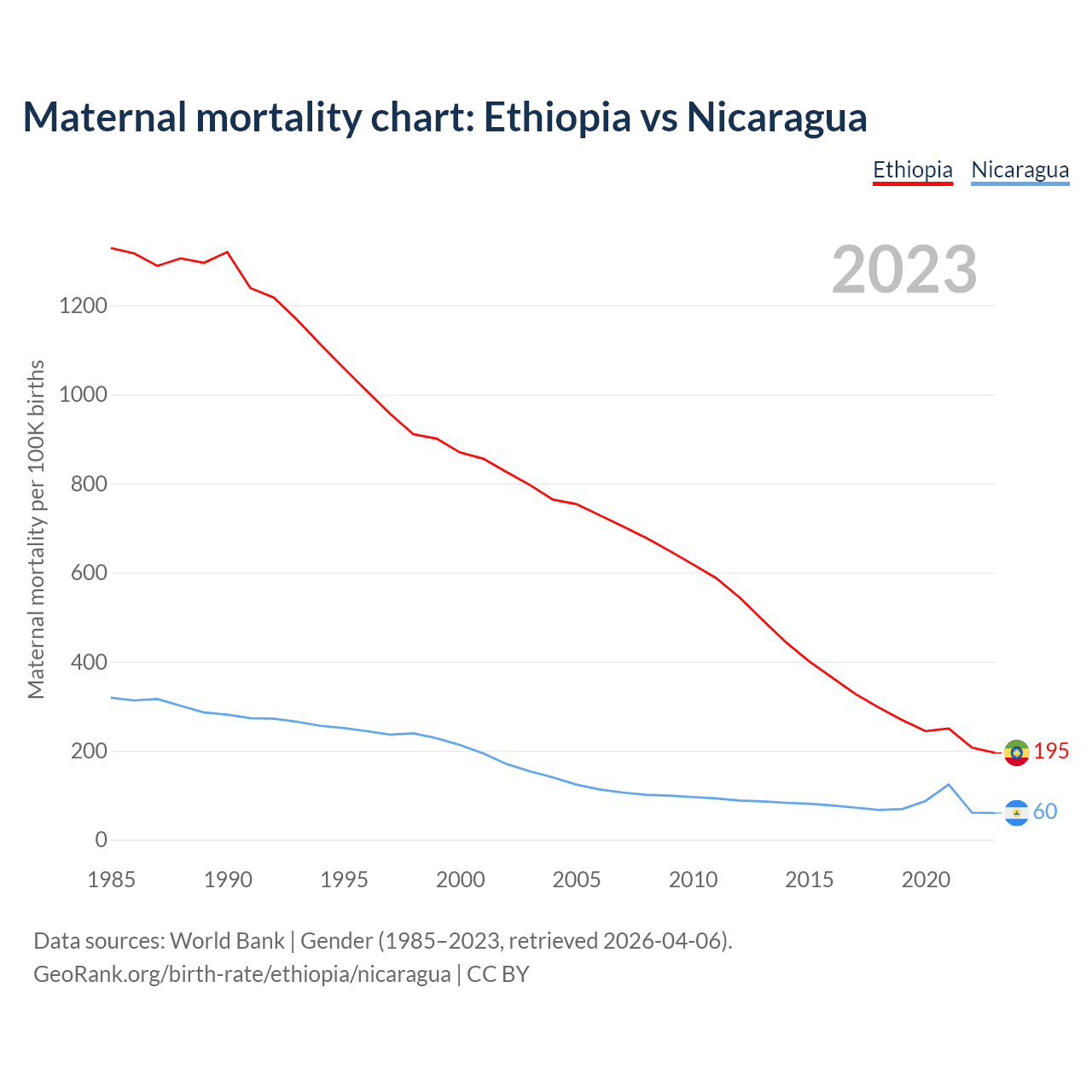 The maternal mortality rate, which is the probability of dying during childbirth or within 42 days of pregnancy termination, is 195 deaths per 100,000 live births in Ethiopia, compared to 60 deaths in Nicaragua.