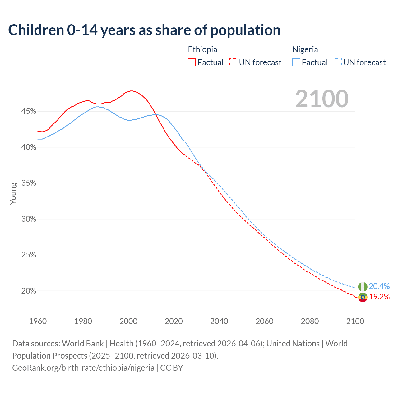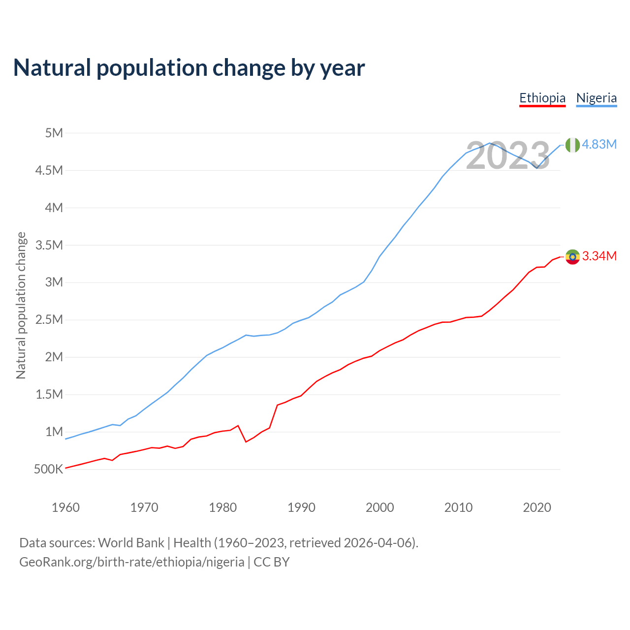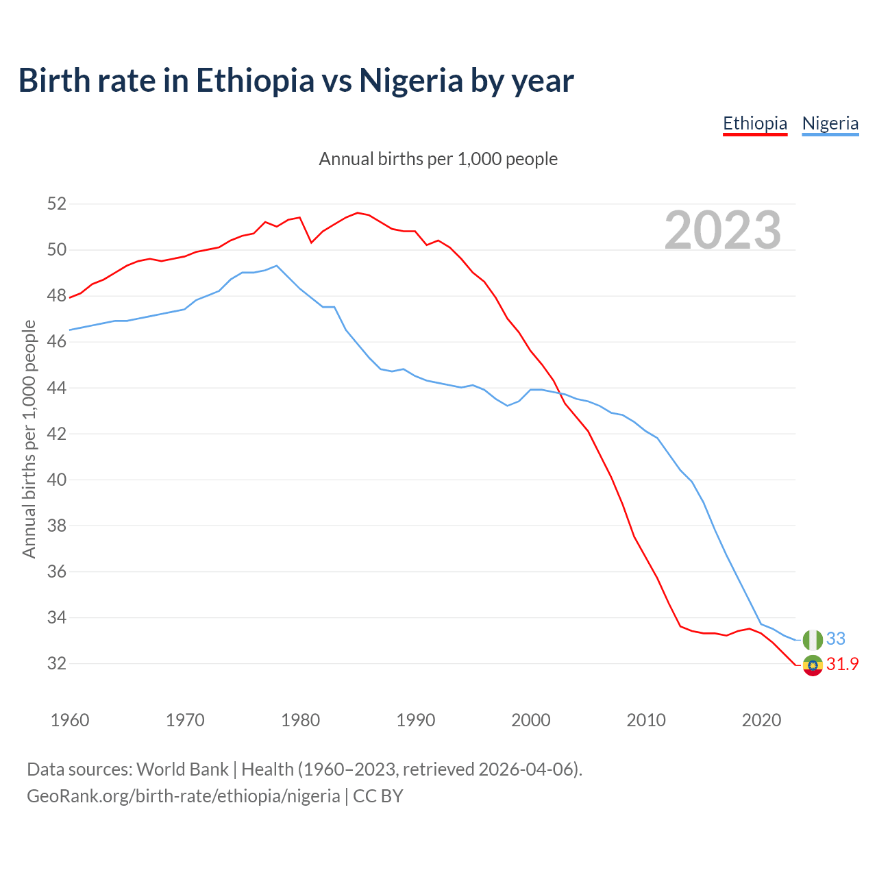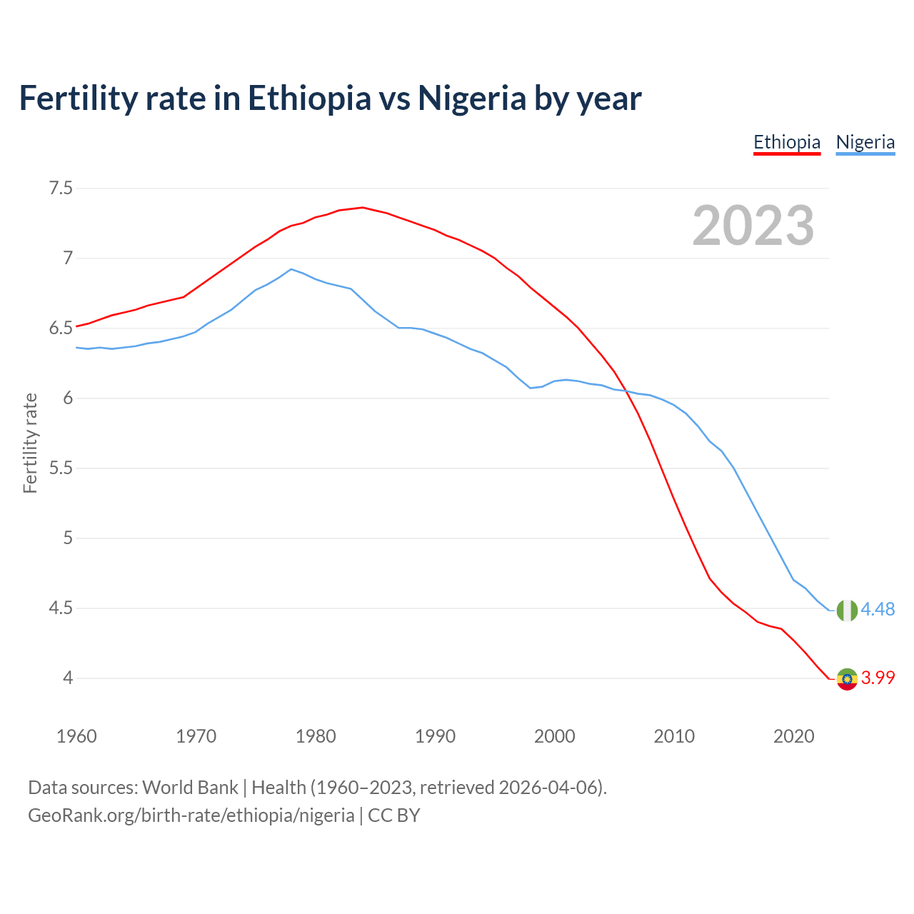 According to the latest available data on birth rates, the fertility rate in Ethiopia was 3.99 children per woman in 2023, compared to 4.48 in Nigeria in 2023. The replacement level is considered to be 2.1 children per woman.
