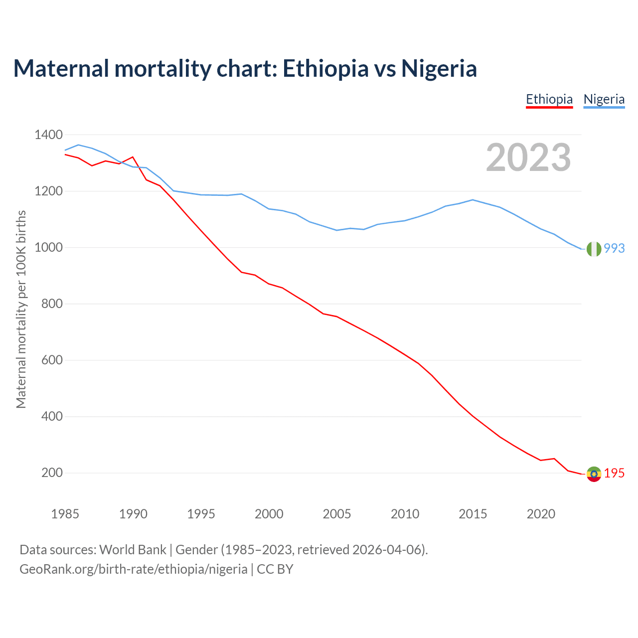 The maternal mortality rate, which is the probability of dying during childbirth or within 42 days of pregnancy termination, is 195 deaths per 100,000 live births in Ethiopia, compared to 993 deaths in Nigeria.