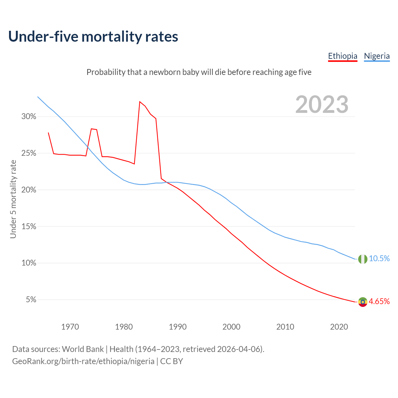The chance that a newborn baby will die before reaching age five is 4.65% in Ethiopia and 10.5% in Nigeria. Above is a chart with historical data on under-five mortality rates.