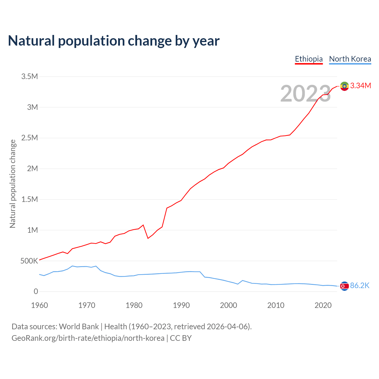 According to the latest available data on birth rates, the fertility rate in Ethiopia was 3.99 children per woman in 2023, compared to 1.78 in North Korea in 2023. The replacement level is considered to be 2.1 children per woman.