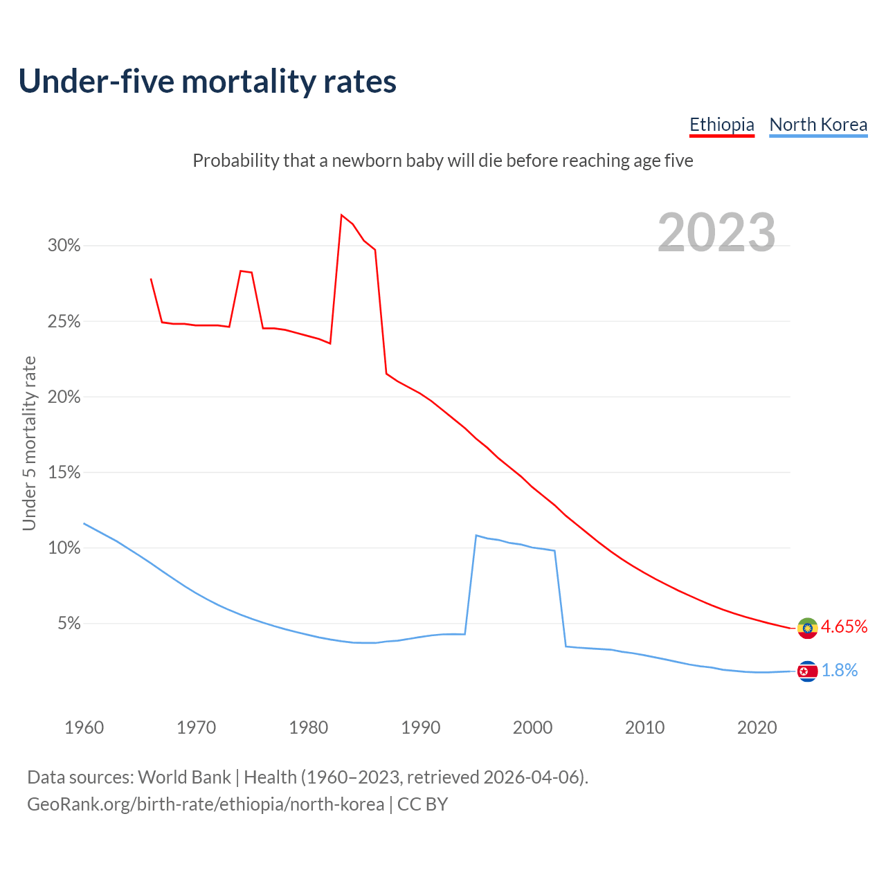 The chance that a newborn baby will die before reaching age five is 4.65% in Ethiopia and 1.8% in North Korea. Above is a chart with historical data on under-five mortality rates.