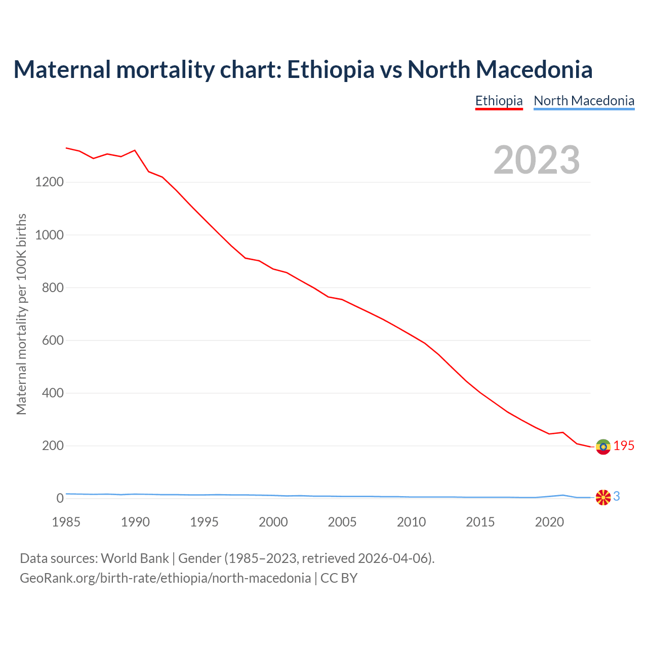 The maternal mortality rate, which is the probability of dying during childbirth or within 42 days of pregnancy termination, is 195 deaths per 100,000 live births in Ethiopia, compared to 3 deaths in North Macedonia.
