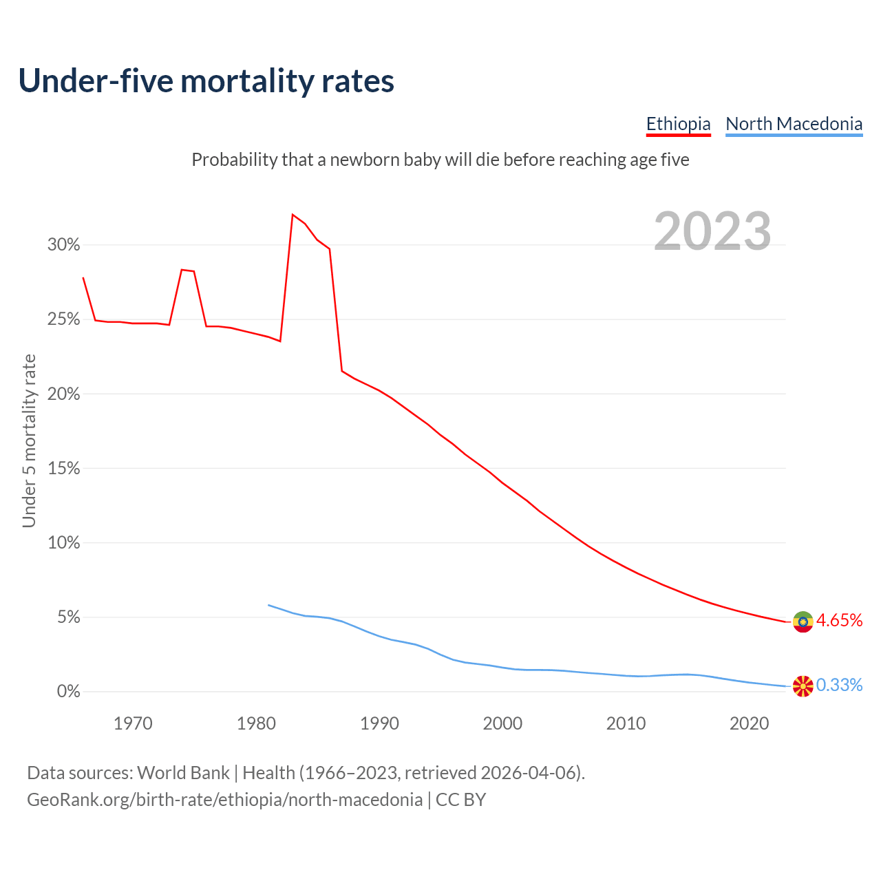 The chance that a newborn baby will die before reaching age five is 4.65% in Ethiopia and 0.33% in North Macedonia. Above is a chart with historical data on under-five mortality rates.