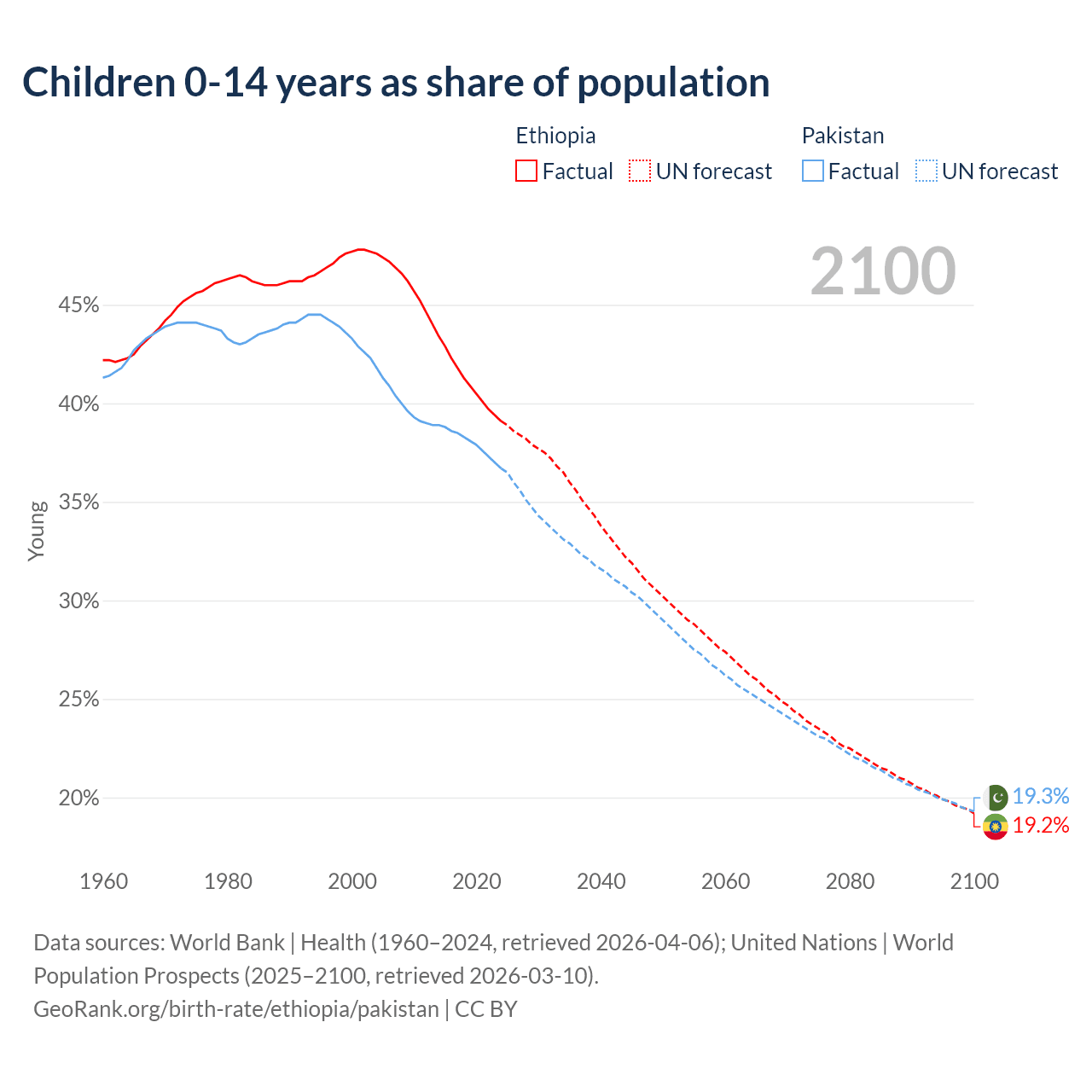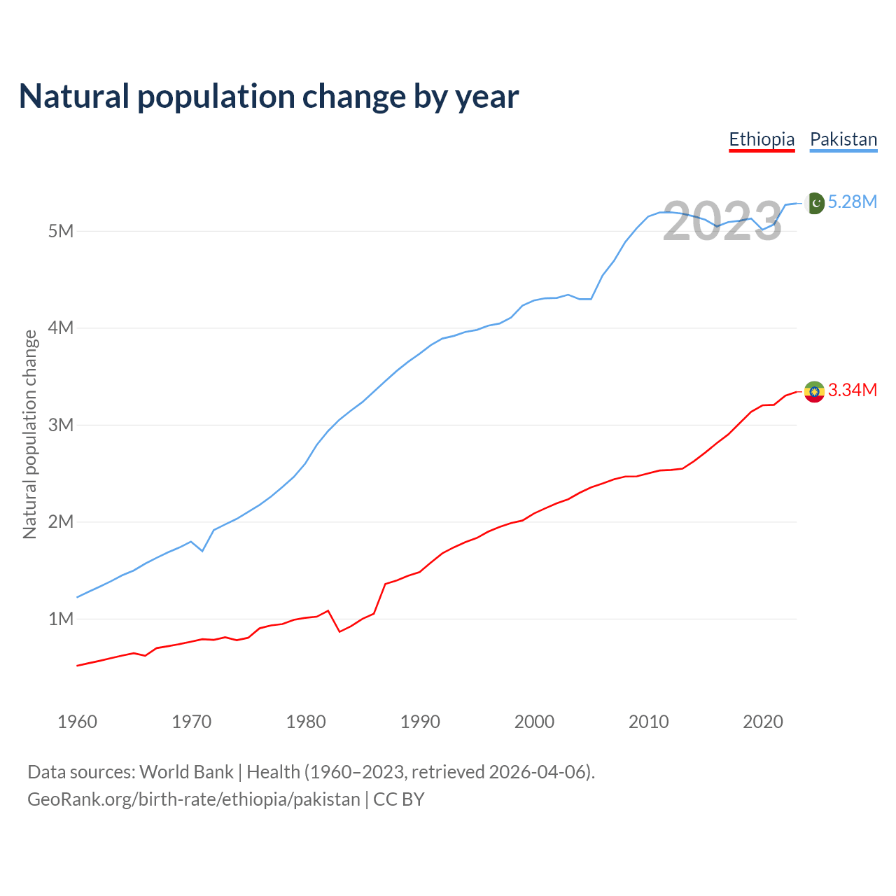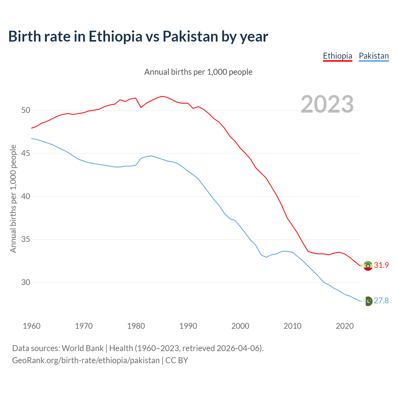 According to the latest available data on birth rates, the fertility rate in Ethiopia was 3.99 children per woman in 2023, compared to 3.61 in Pakistan in 2023. The replacement level is considered to be 2.1 children per woman.