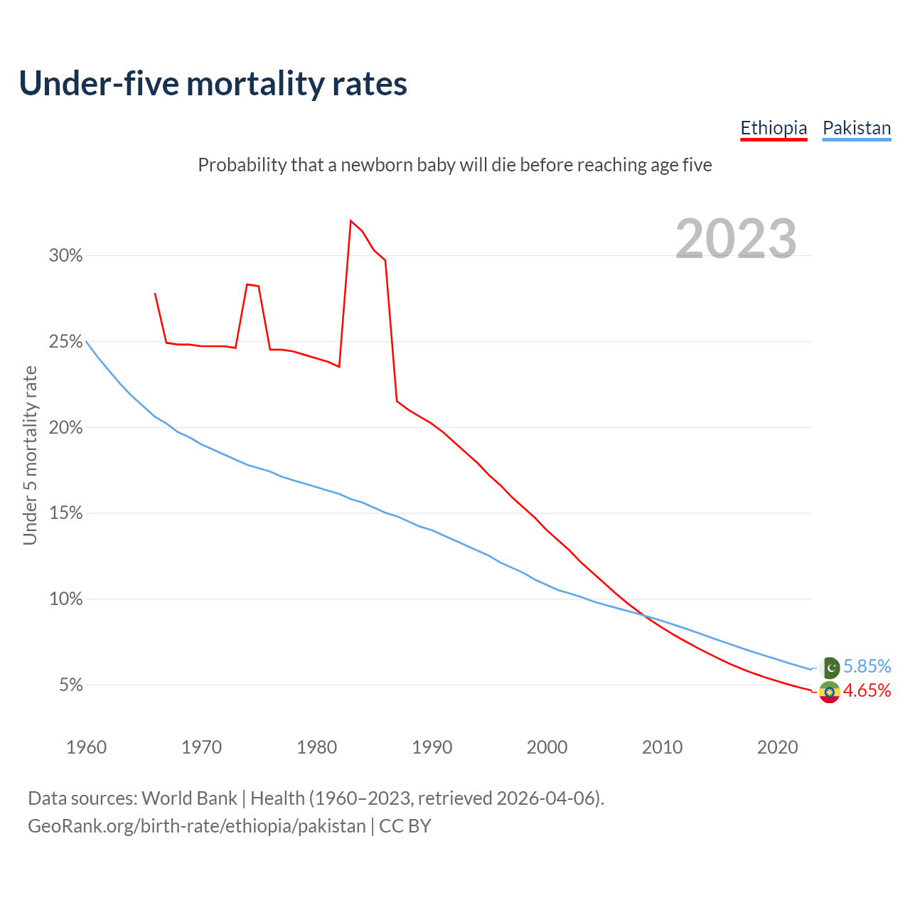 The chance that a newborn baby will die before reaching age five is 4.65% in Ethiopia and 5.85% in Pakistan. Above is a chart with historical data on under-five mortality rates.