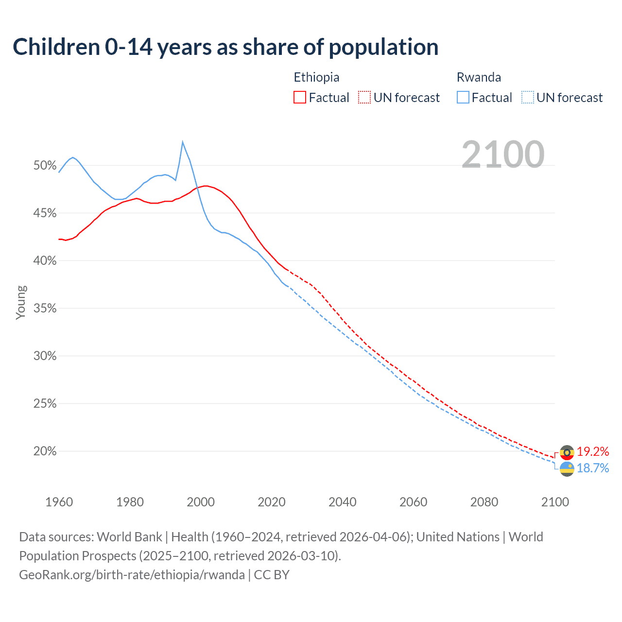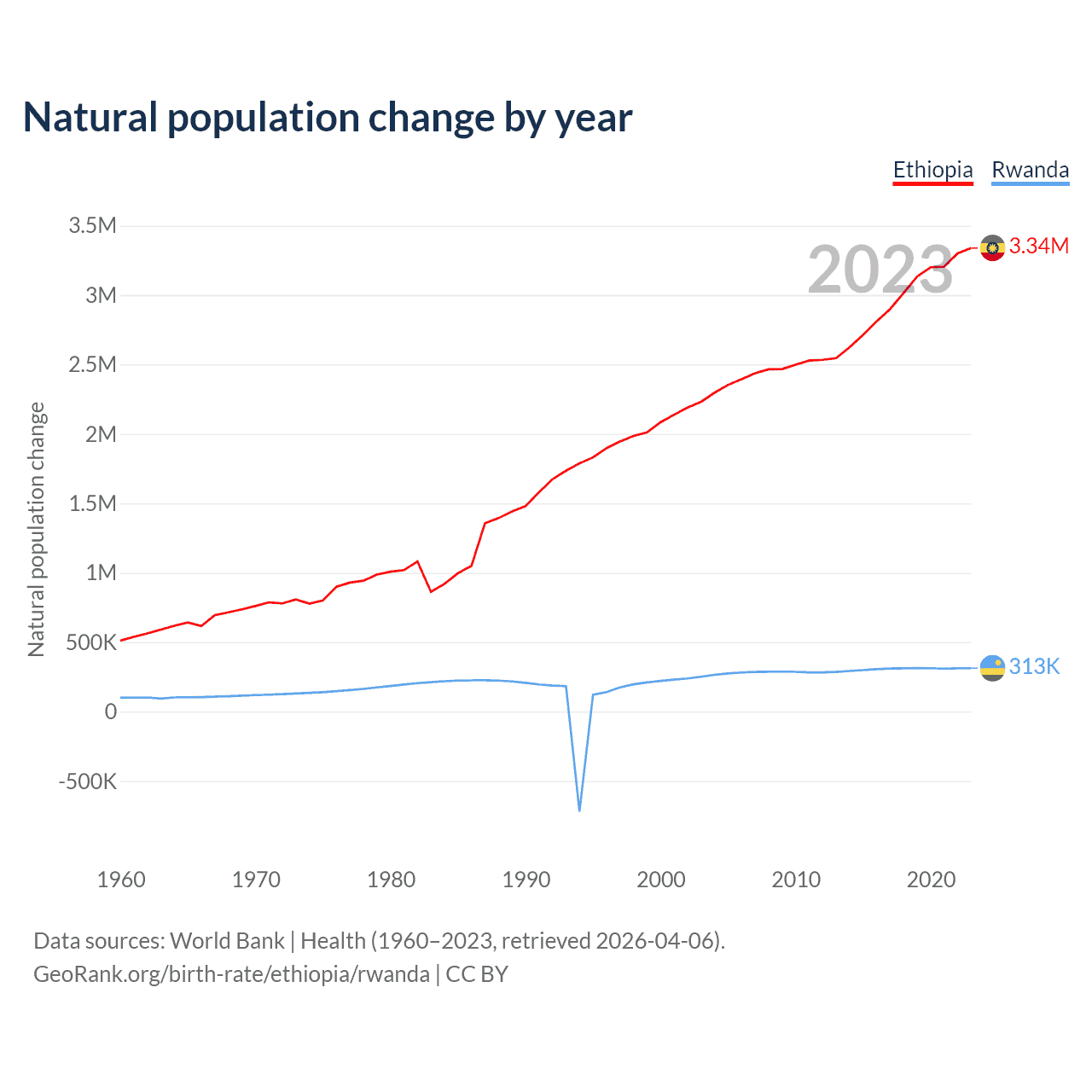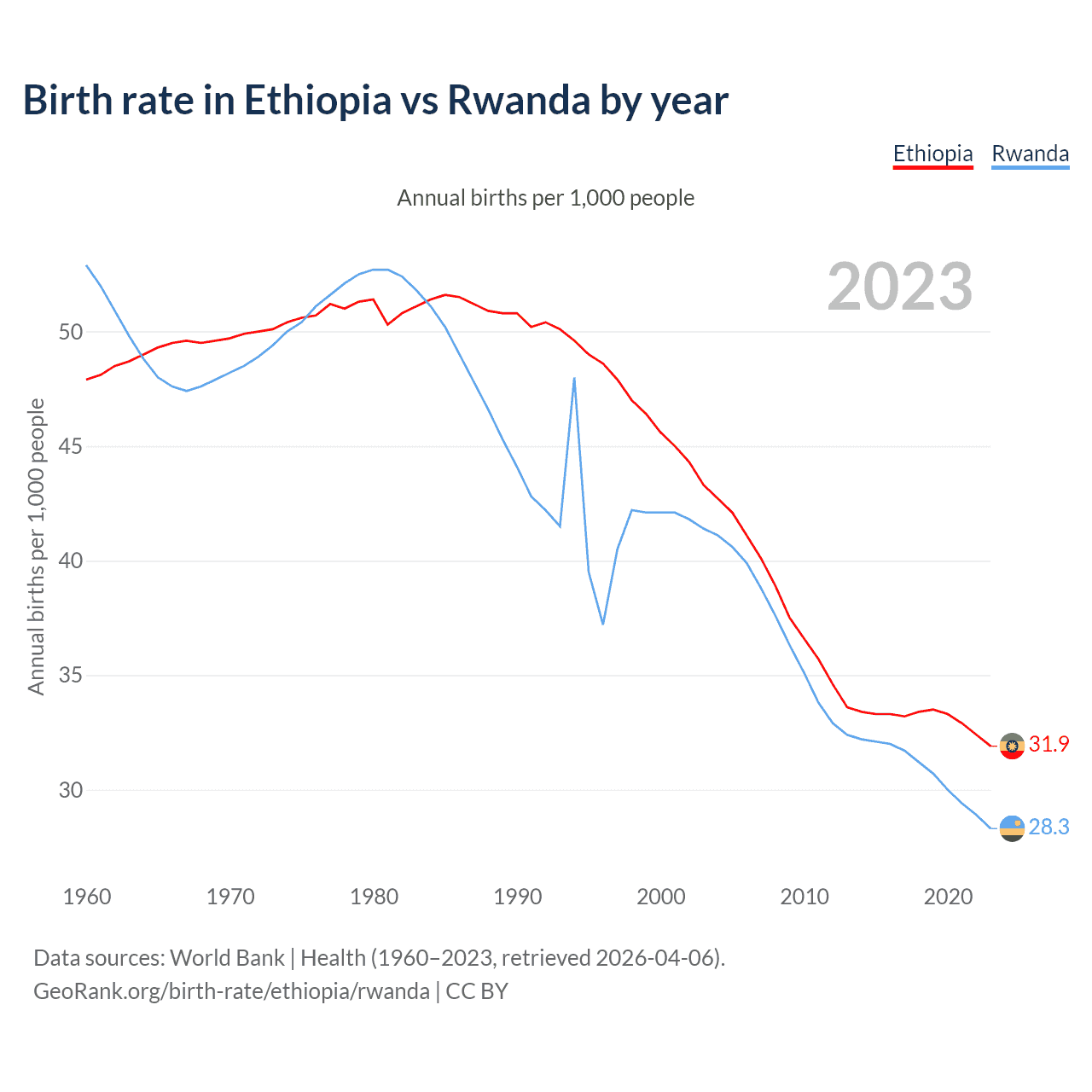 According to the latest available data on birth rates, the fertility rate in Ethiopia was 3.99 children per woman in 2023, compared to 3.7 in Rwanda in 2023. The replacement level is considered to be 2.1 children per woman.