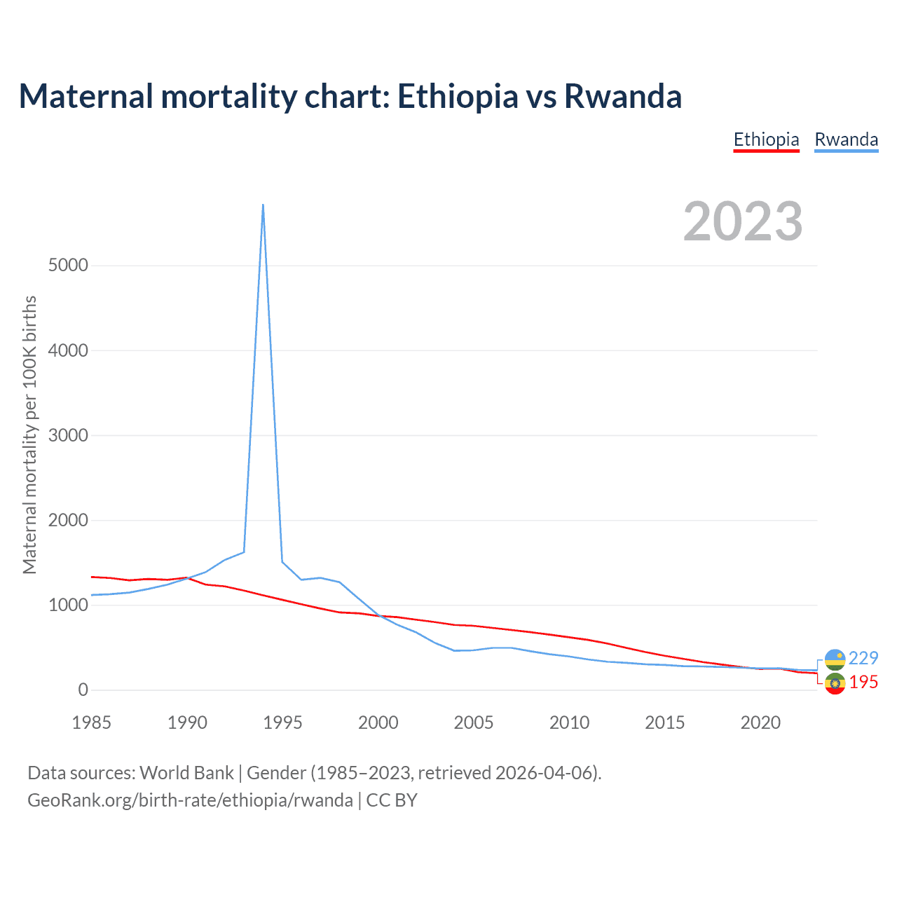 The maternal mortality rate, which is the probability of dying during childbirth or within 42 days of pregnancy termination, is 195 deaths per 100,000 live births in Ethiopia, compared to 229 deaths in Rwanda.