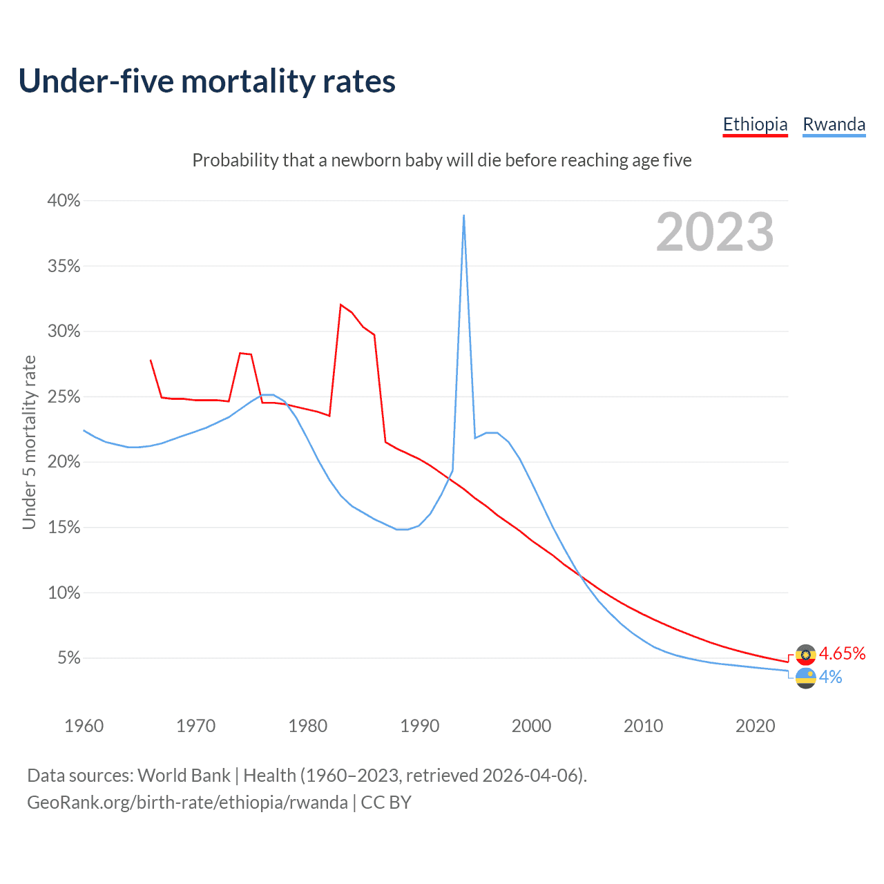 The chance that a newborn baby will die before reaching age five is 4.65% in Ethiopia and 4% in Rwanda. Above is a chart with historical data on under-five mortality rates.