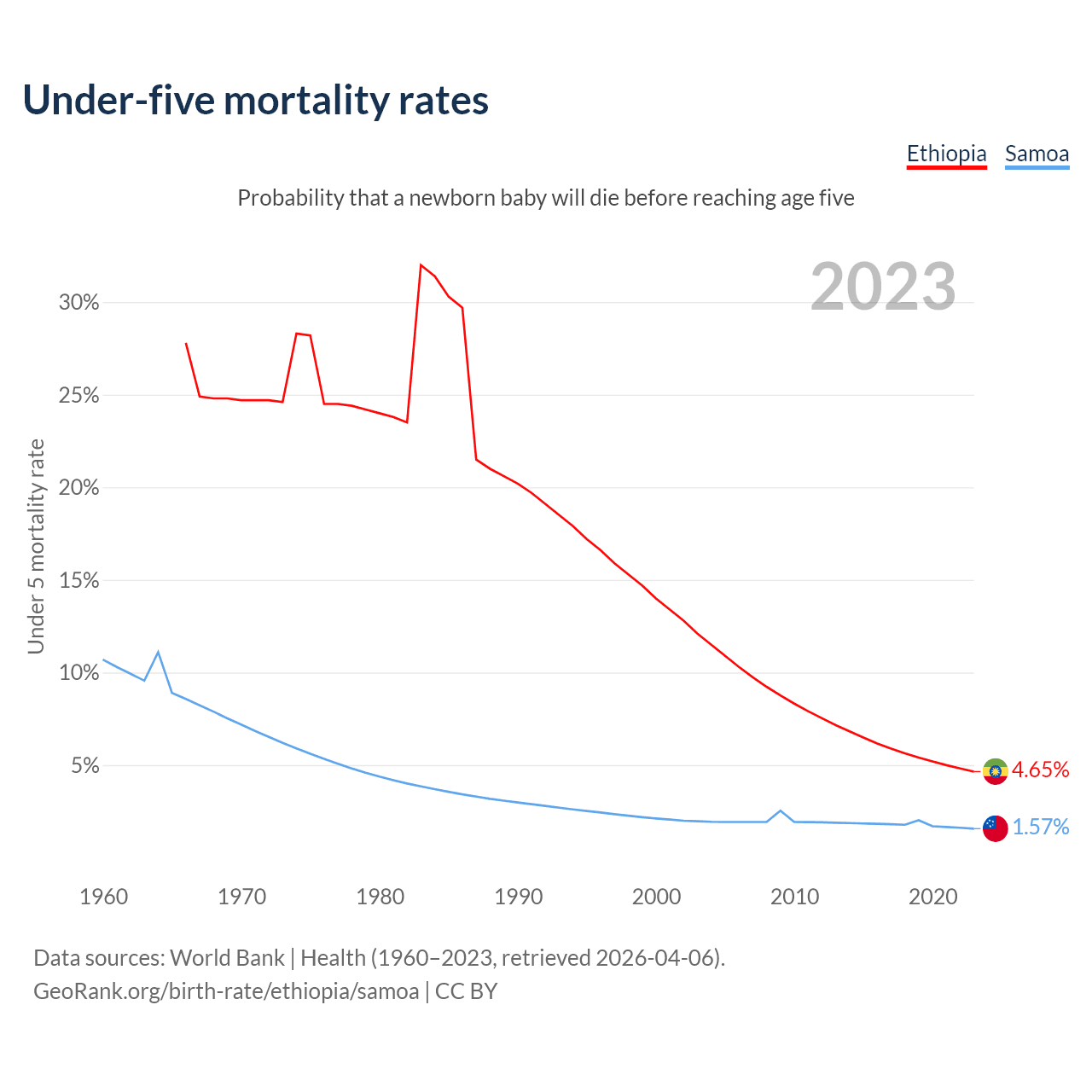 The chance that a newborn baby will die before reaching age five is 4.65% in Ethiopia and 1.57% in Samoa. Above is a chart with historical data on under-five mortality rates.