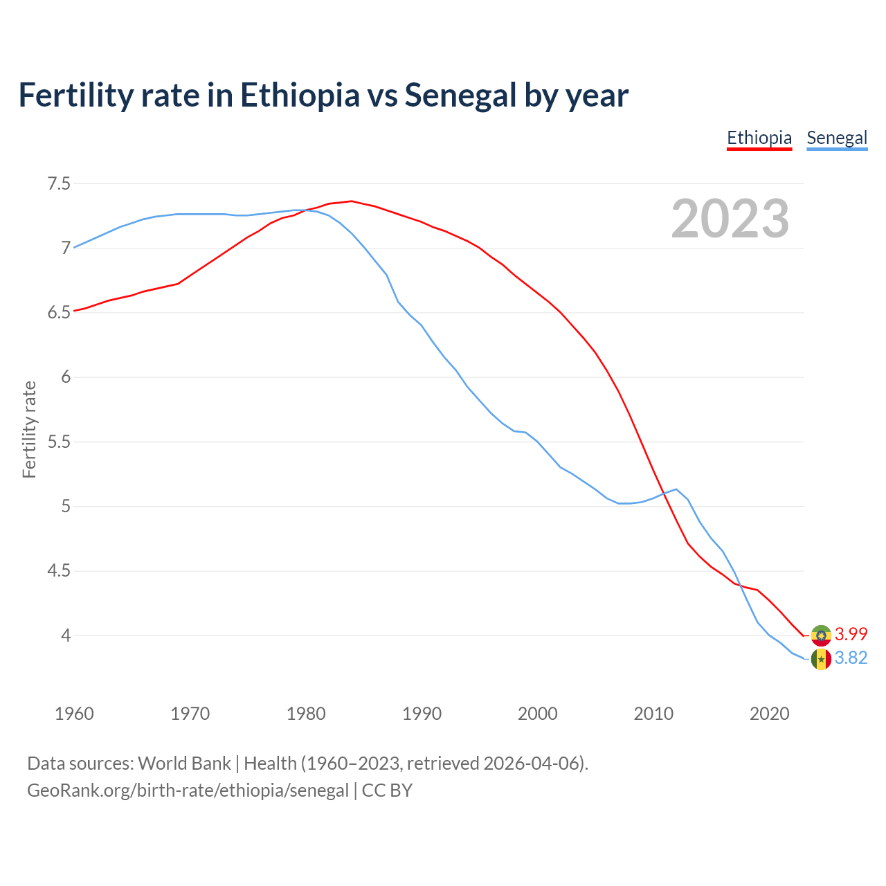 1960 vs 2023, the fertility rate has decreased by 38.8% in Ethiopia and by 45.4% in Senegal — in 1960, it was 6.51 and 7, respectively.