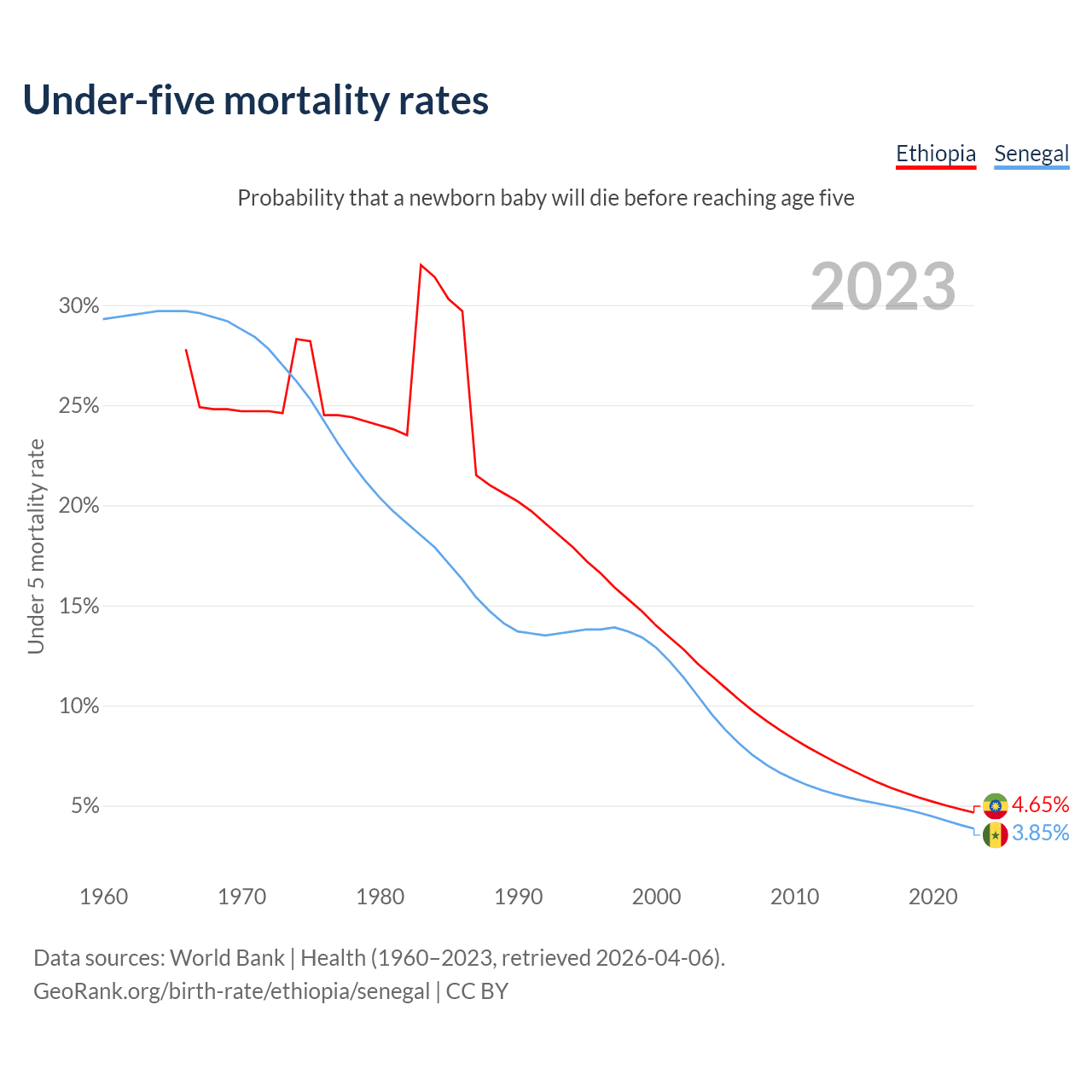 The chance that a newborn baby will die before reaching age five is 4.65% in Ethiopia and 3.85% in Senegal. Above is a chart with historical data on under-five mortality rates.