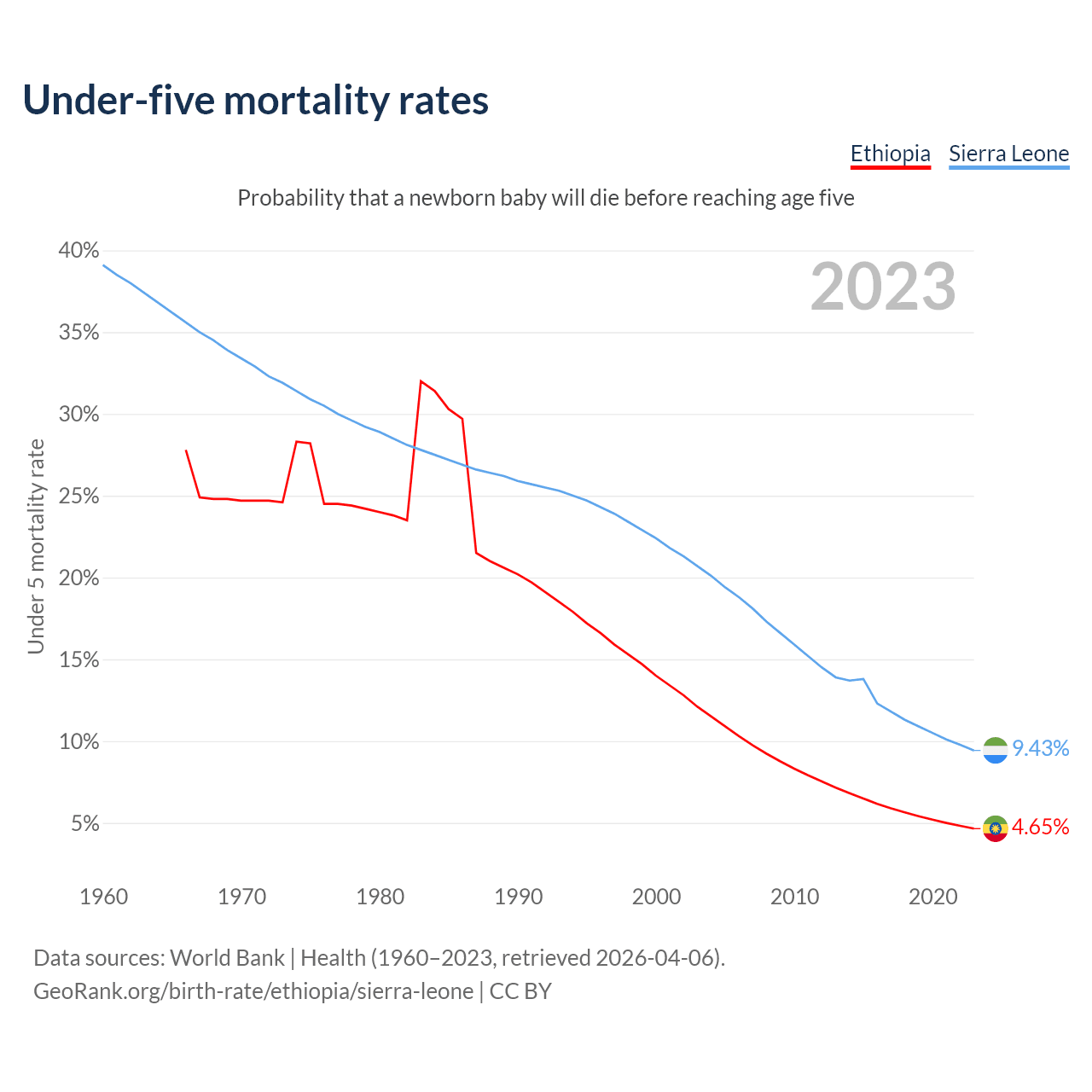 The chance that a newborn baby will die before reaching age five is 4.65% in Ethiopia and 9.43% in Sierra Leone. Above is a chart with historical data on under-five mortality rates.