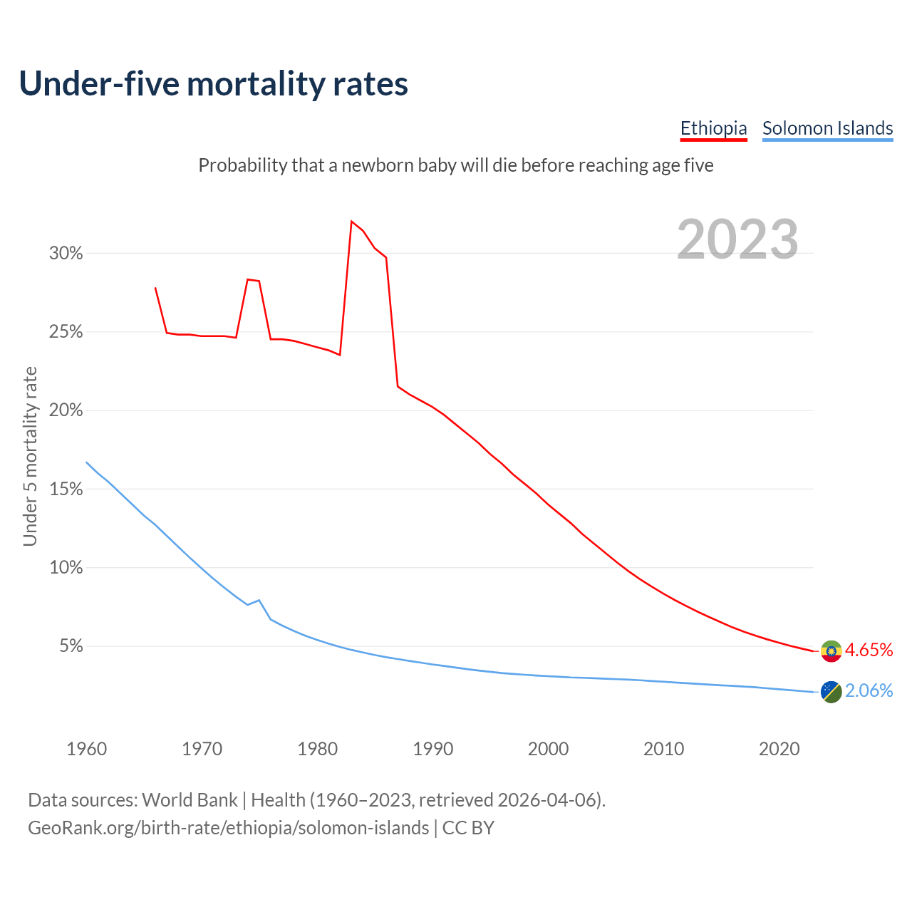 The chance that a newborn baby will die before reaching age five is 4.65% in Ethiopia and 2.06% in the Solomon Islands. Above is a chart with historical data on under-five mortality rates.