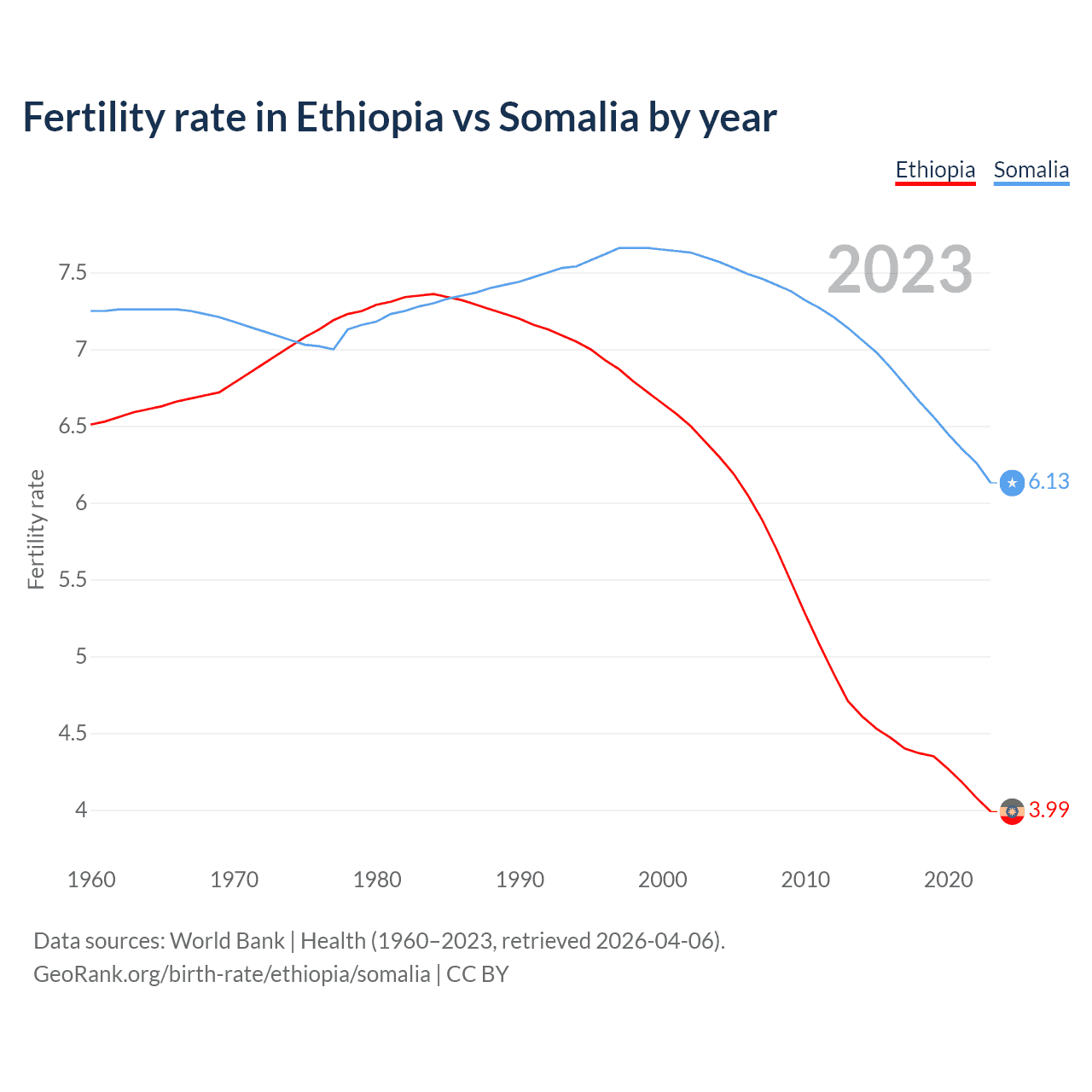 1960 vs 2023, the fertility rate has decreased by 38.8% in Ethiopia and by 15.4% in Somalia — in 1960, it was 6.51 and 7.25, respectively.