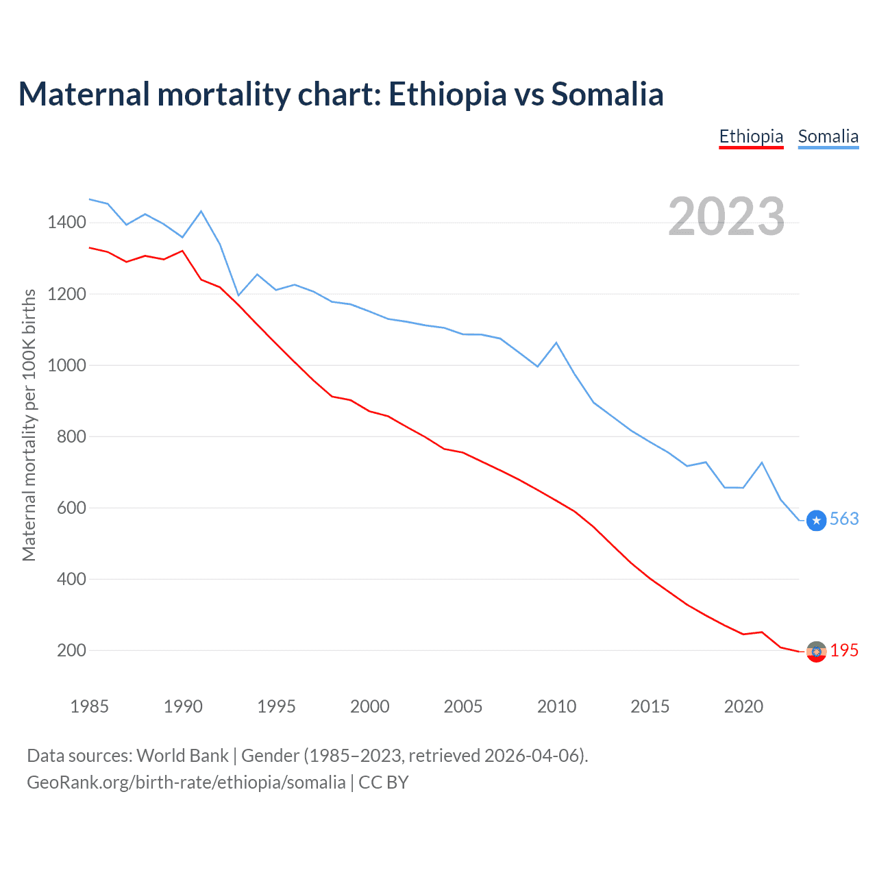 The maternal mortality rate, which is the probability of dying during childbirth or within 42 days of pregnancy termination, is 195 deaths per 100,000 live births in Ethiopia, compared to 563 deaths in Somalia.
