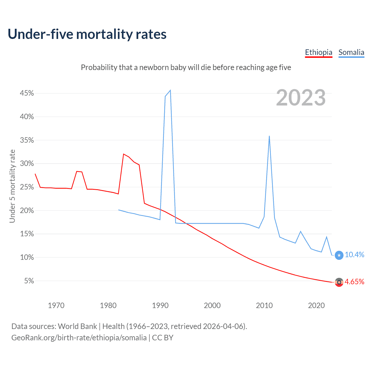 The chance that a newborn baby will die before reaching age five is 4.65% in Ethiopia and 10.4% in Somalia. Above is a chart with historical data on under-five mortality rates.