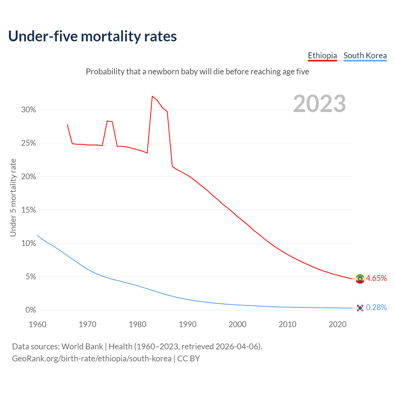 The chance that a newborn baby will die before reaching age five is 4.65% in Ethiopia and 0.28% in South Korea. Above is a chart with historical data on under-five mortality rates.