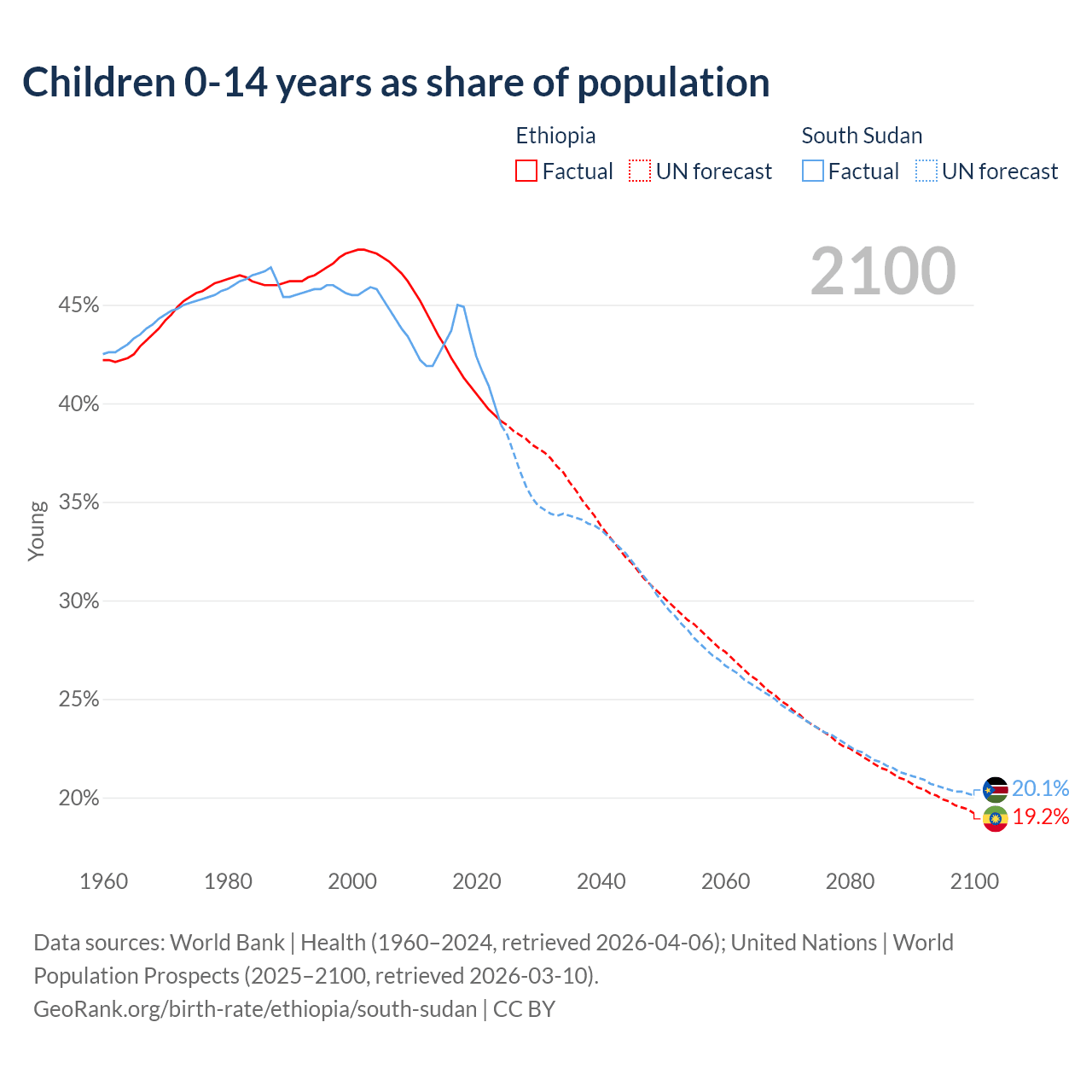According to the latest available data on birth rates, the fertility rate in Ethiopia was 3.99 children per woman in 2023, compared to 3.86 in South Sudan in 2023. The replacement level is considered to be 2.1 children per woman.