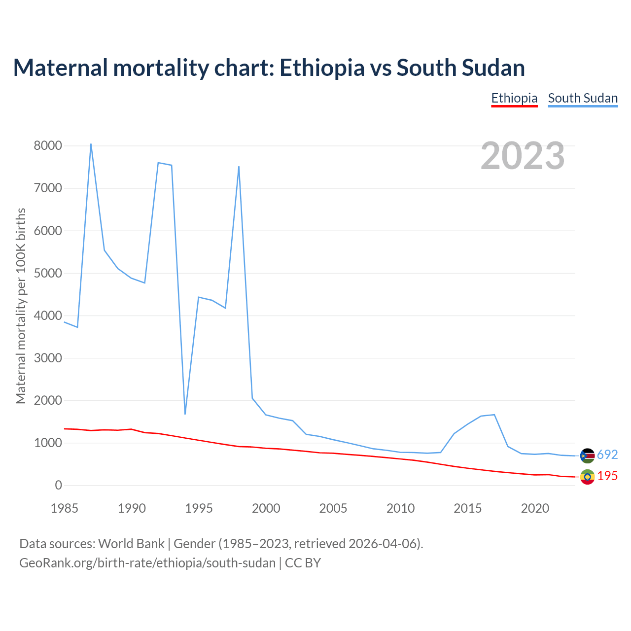 The maternal mortality rate, which is the probability of dying during childbirth or within 42 days of pregnancy termination, is 195 deaths per 100,000 live births in Ethiopia, compared to 692 deaths in South Sudan.