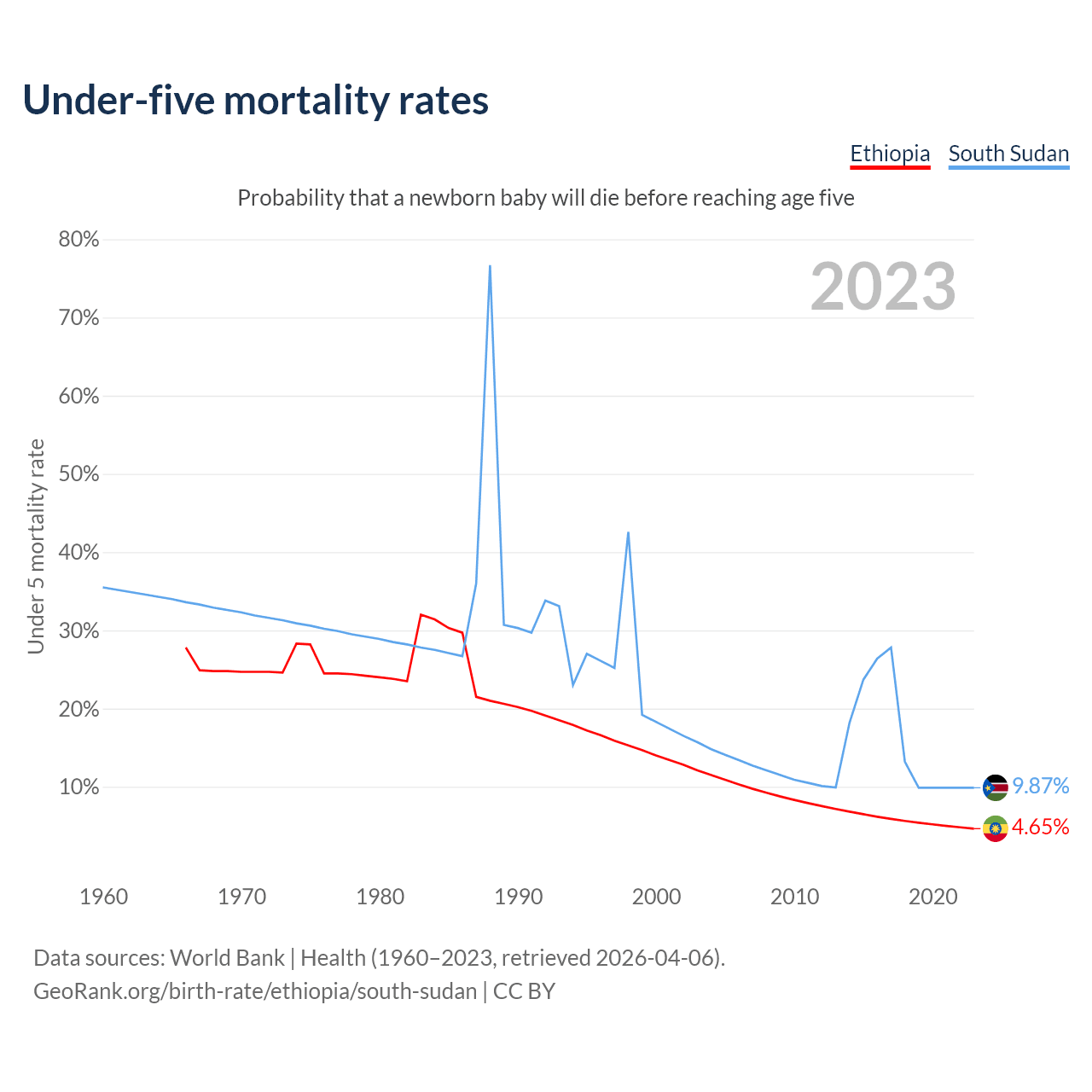 The chance that a newborn baby will die before reaching age five is 4.65% in Ethiopia and 9.87% in South Sudan. Above is a chart with historical data on under-five mortality rates.