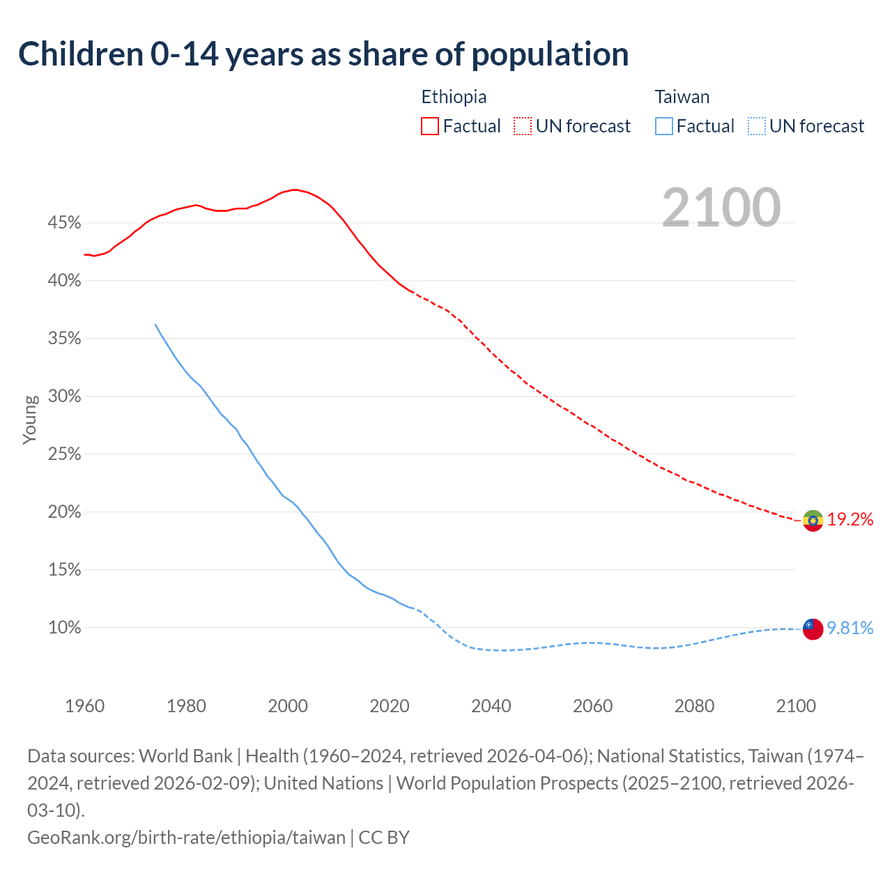Data sources: World Bank | Health (1960–2024, retrieved 2026-04-06); National Statistics, Taiwan (1974–2024, retrieved 2026-02-09); United Nations | World Population Prospects (2025–2100, retrieved 2026-03-10).