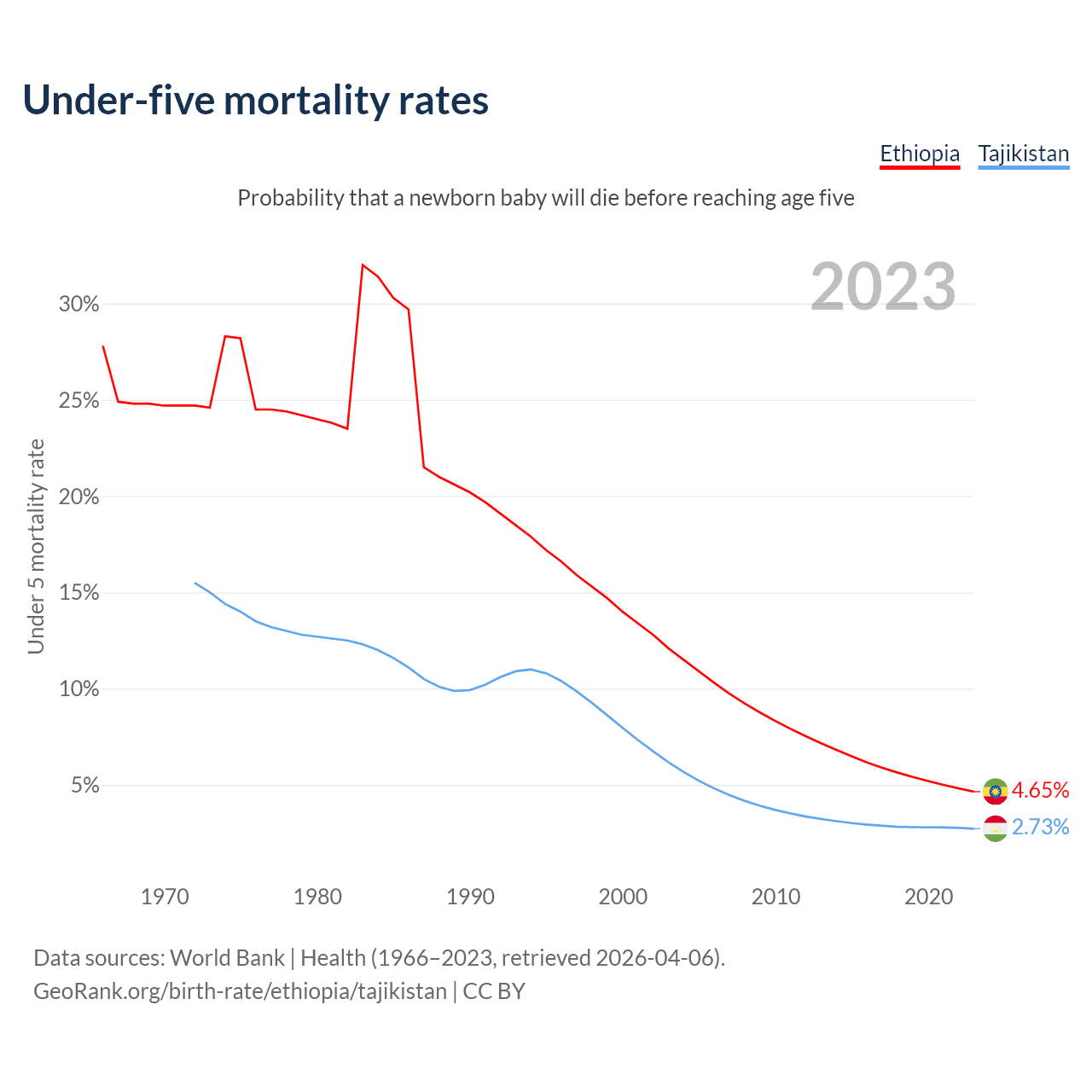 The chance that a newborn baby will die before reaching age five is 4.65% in Ethiopia and 2.73% in Tajikistan. Above is a chart with historical data on under-five mortality rates.