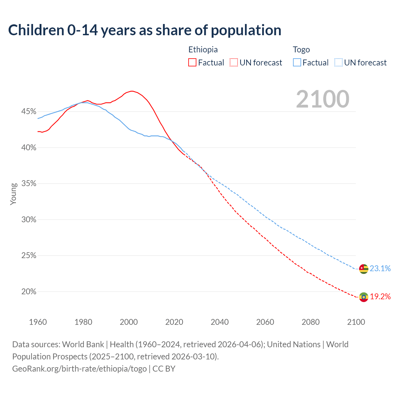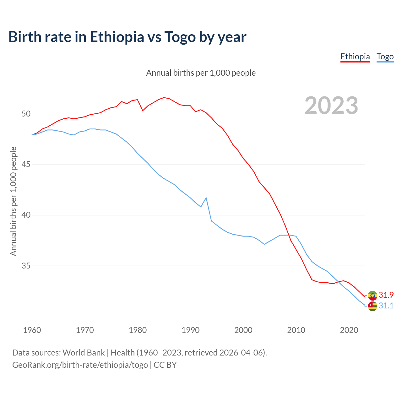 According to the latest available data on birth rates, the fertility rate in Ethiopia was 3.99 children per woman in 2023, compared to 4.19 in Togo in 2023. The replacement level is considered to be 2.1 children per woman.