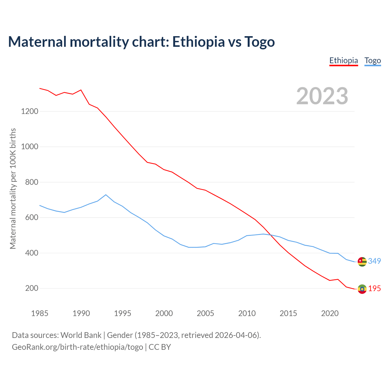 The maternal mortality rate, which is the probability of dying during childbirth or within 42 days of pregnancy termination, is 195 deaths per 100,000 live births in Ethiopia, compared to 349 deaths in Togo.