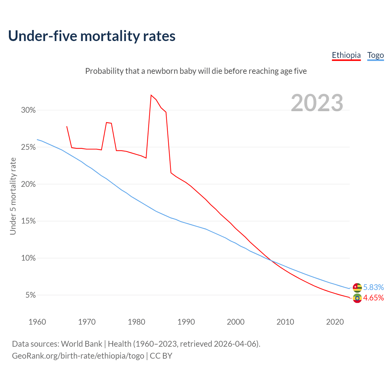 The chance that a newborn baby will die before reaching age five is 4.65% in Ethiopia and 5.83% in Togo. Above is a chart with historical data on under-five mortality rates.