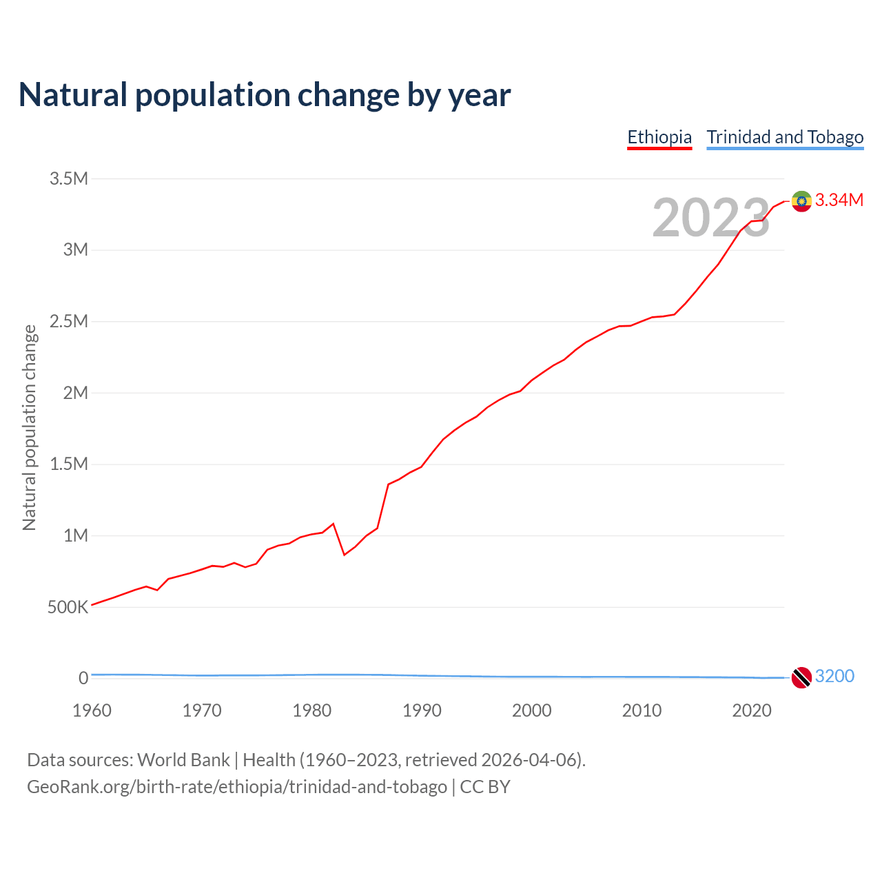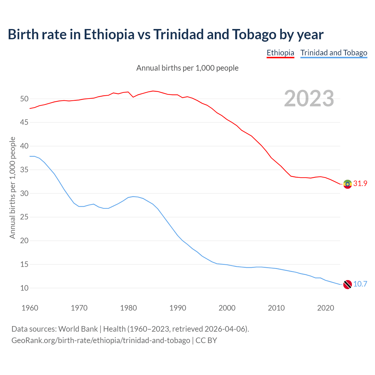 Ethiopia has an annual birth rate of 31.9 births per 1,000 people, compared to 10.7 for Trinidad and Tobago. The average number of children a woman is expected to have during her lifetime — the fertility rate, is 3.99 in Ethiopia and 1.53 in Trinidad and Tobago — 61.6% difference.