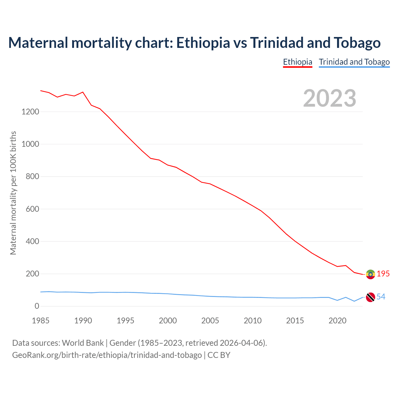 The maternal mortality rate, which is the probability of dying during childbirth or within 42 days of pregnancy termination, is 195 deaths per 100,000 live births in Ethiopia, compared to 54 deaths in Trinidad and Tobago.