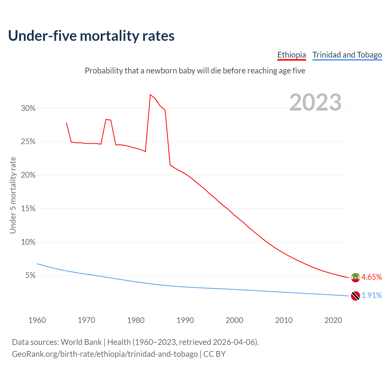 The chance that a newborn baby will die before reaching age five is 4.65% in Ethiopia and 1.91% in Trinidad and Tobago. Above is a chart with historical data on under-five mortality rates.