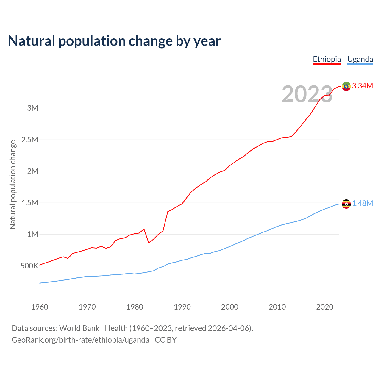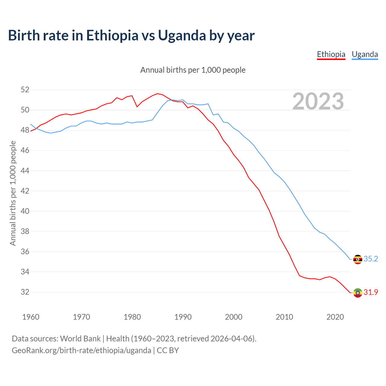 According to the latest available data on birth rates, the fertility rate in Ethiopia was 3.99 children per woman in 2023, compared to 4.28 in Uganda in 2023. The replacement level is considered to be 2.1 children per woman.