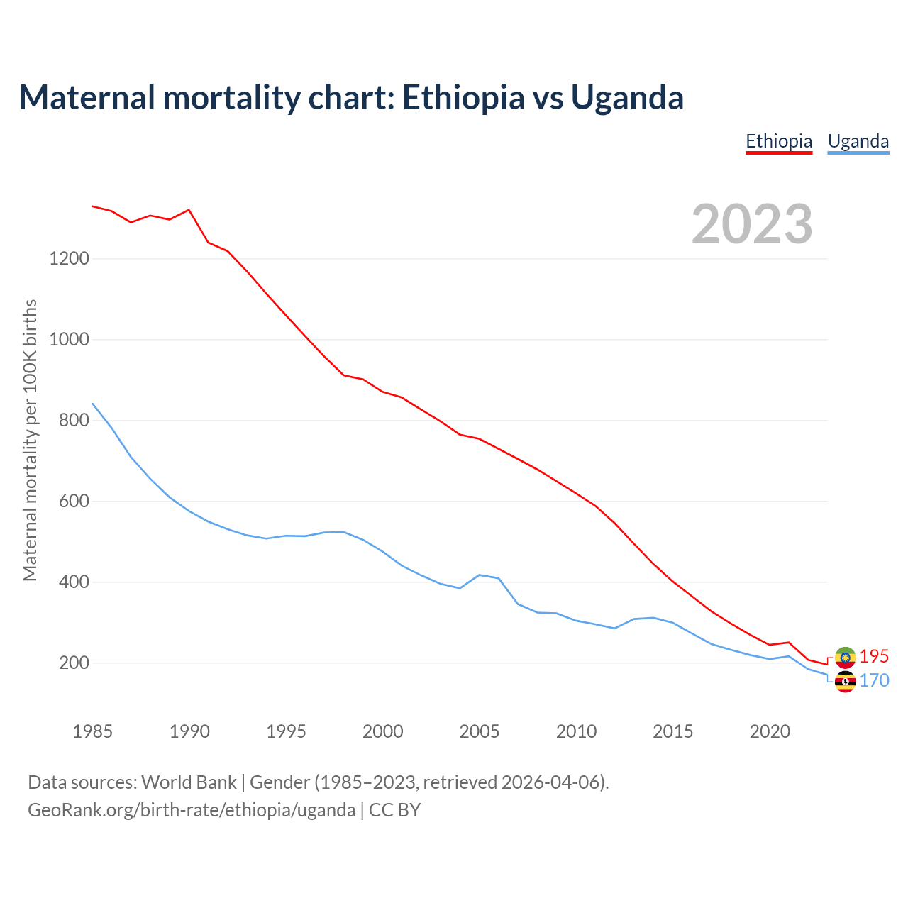 - Annual births per 1,000 women ages 15-19 (adolescent birth rate or teenage mother rate) is 69.9 in Ethiopia vs 107 in Uganda.