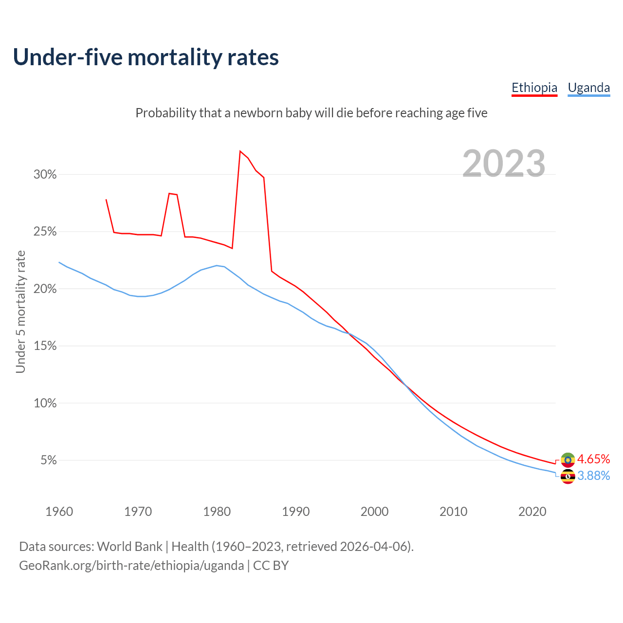 The chance that a newborn baby will die before reaching age five is 4.65% in Ethiopia and 3.88% in Uganda. Above is a chart with historical data on under-five mortality rates.