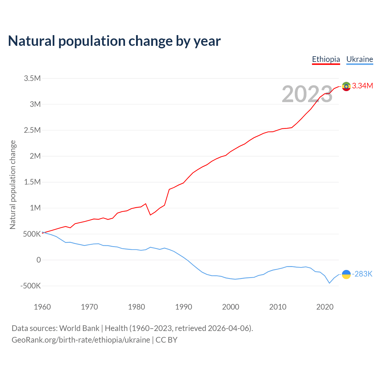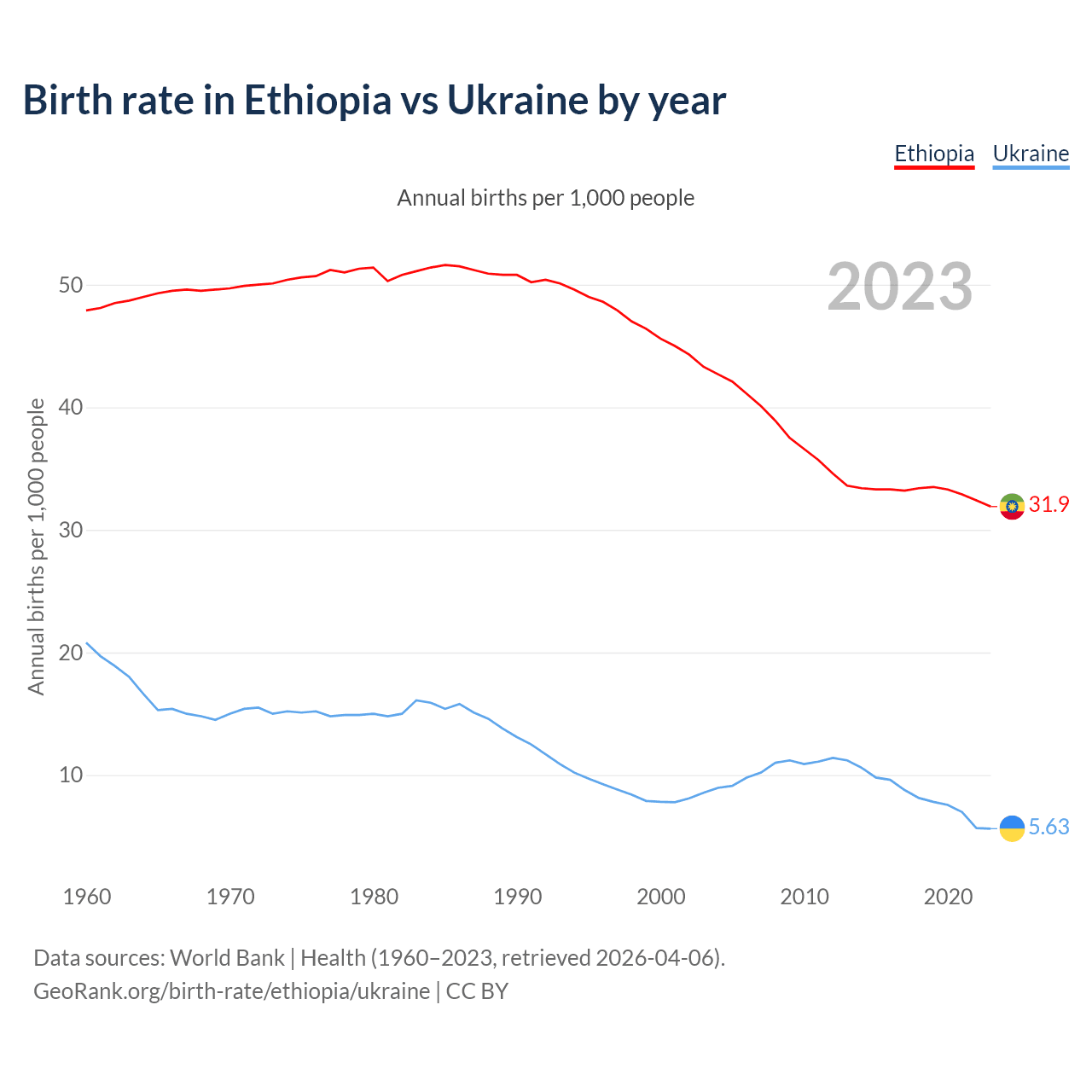 Ethiopia has an annual birth rate of 31.9 births per 1,000 people, compared to 5.63 for Ukraine. The average number of children a woman is expected to have during her lifetime — the fertility rate, is 3.99 in Ethiopia and 0.98 in Ukraine — 75.5% difference.