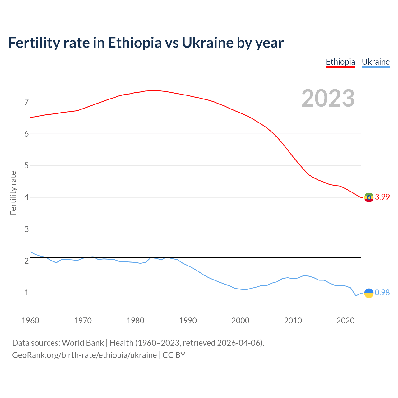 According to the latest available data on birth rates, the fertility rate in Ethiopia was 3.99 children per woman in 2023, compared to 0.98 in Ukraine in 2023. The replacement level is considered to be 2.1 children per woman.