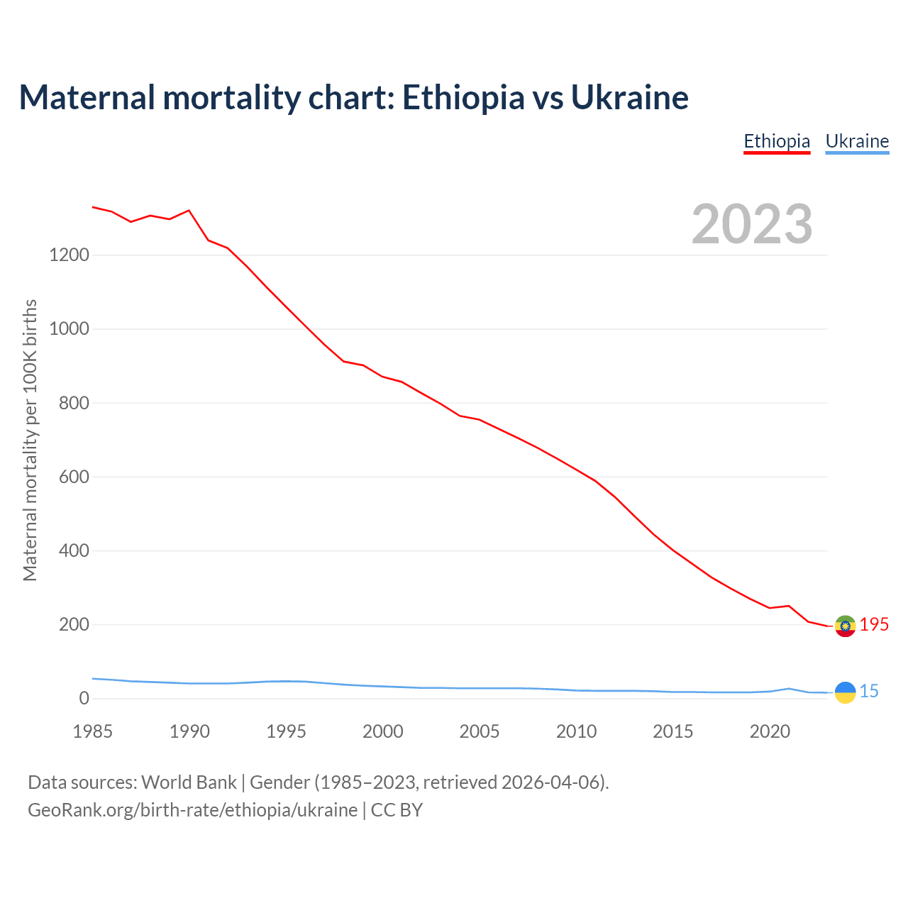 The maternal mortality rate, which is the probability of dying during childbirth or within 42 days of pregnancy termination, is 195 deaths per 100,000 live births in Ethiopia, compared to 15 deaths in Ukraine.