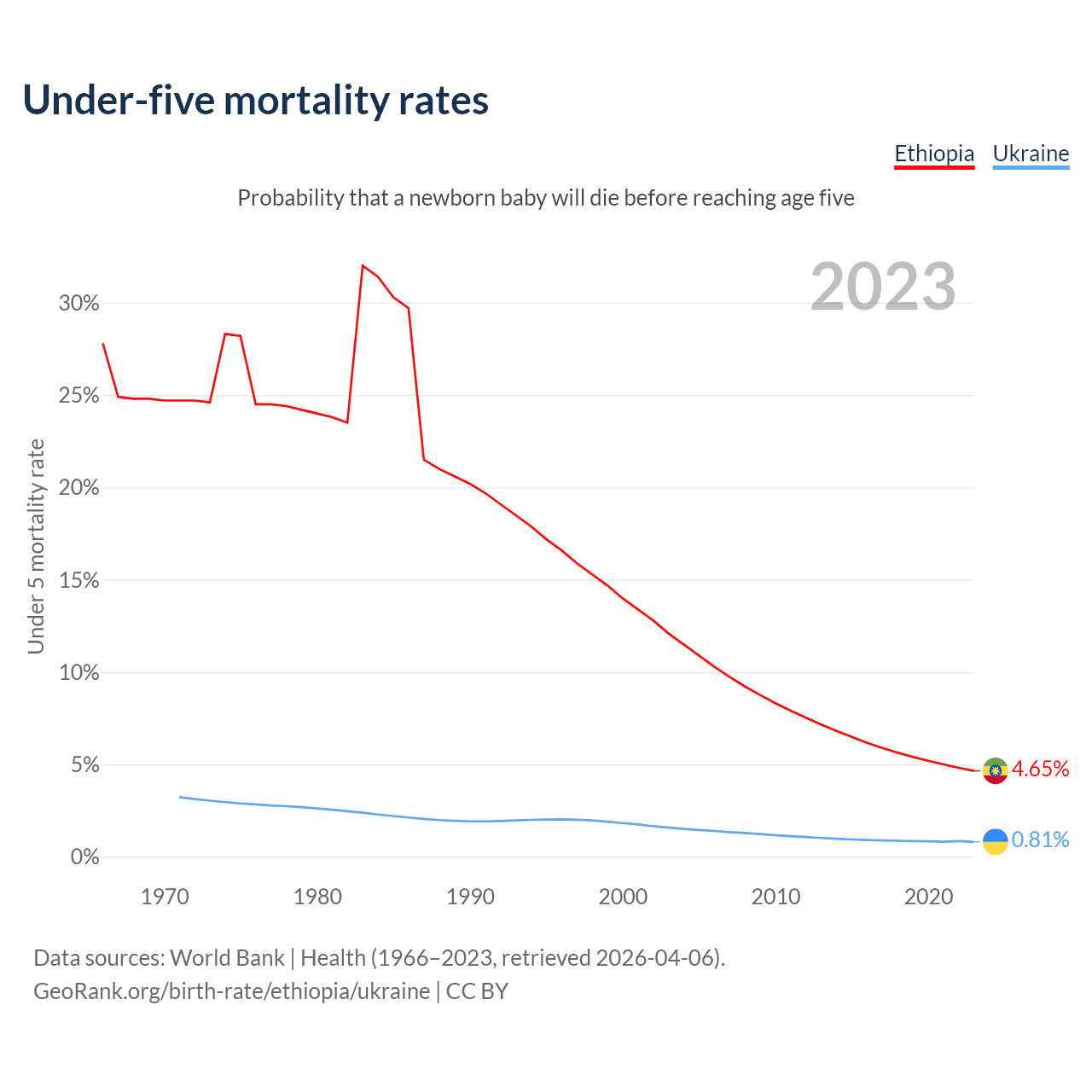 The chance that a newborn baby will die before reaching age five is 4.65% in Ethiopia and 0.81% in Ukraine. Above is a chart with historical data on under-five mortality rates.
