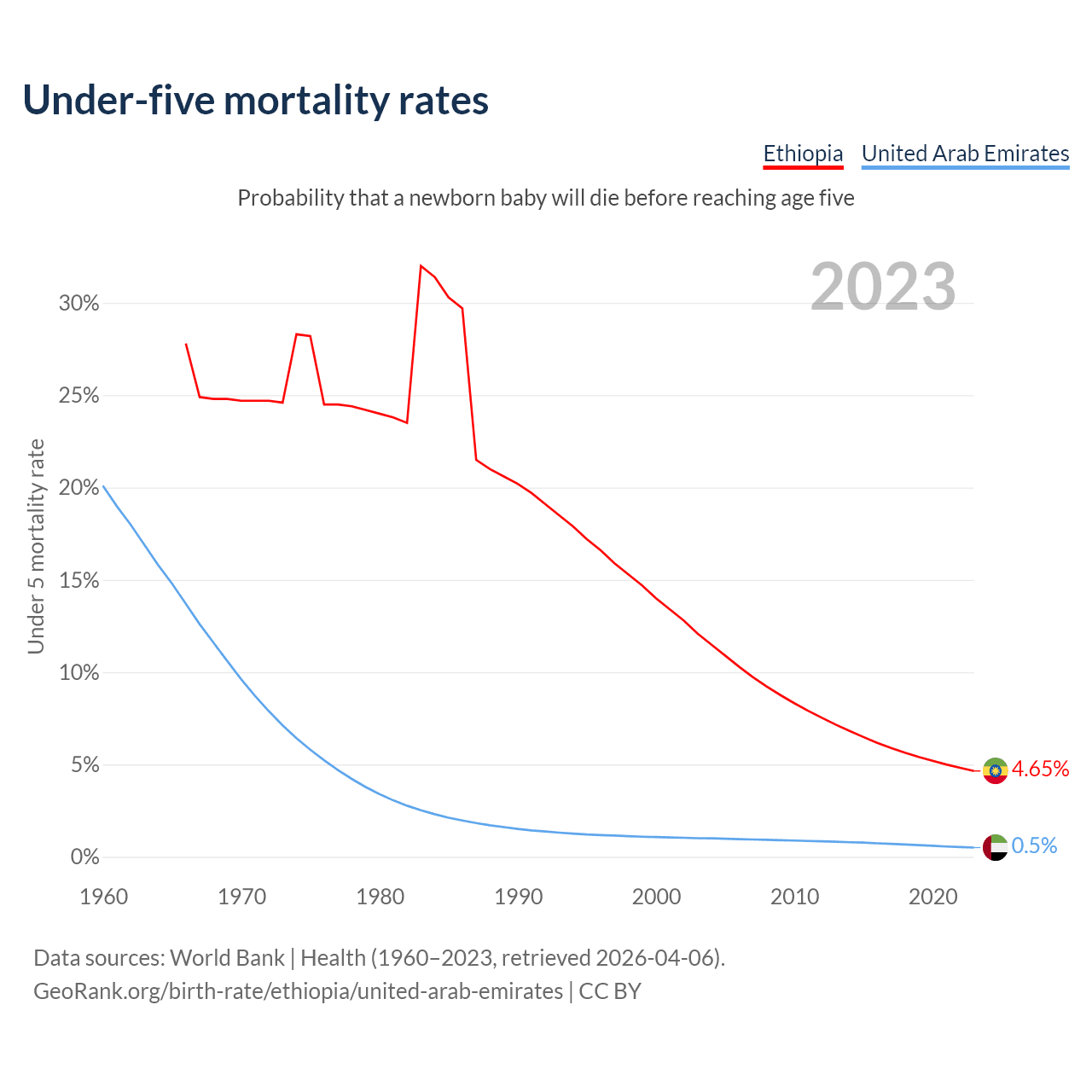 The chance that a newborn baby will die before reaching age five is 4.65% in Ethiopia and 0.5% in the United Arab Emirates. Above is a chart with historical data on under-five mortality rates.