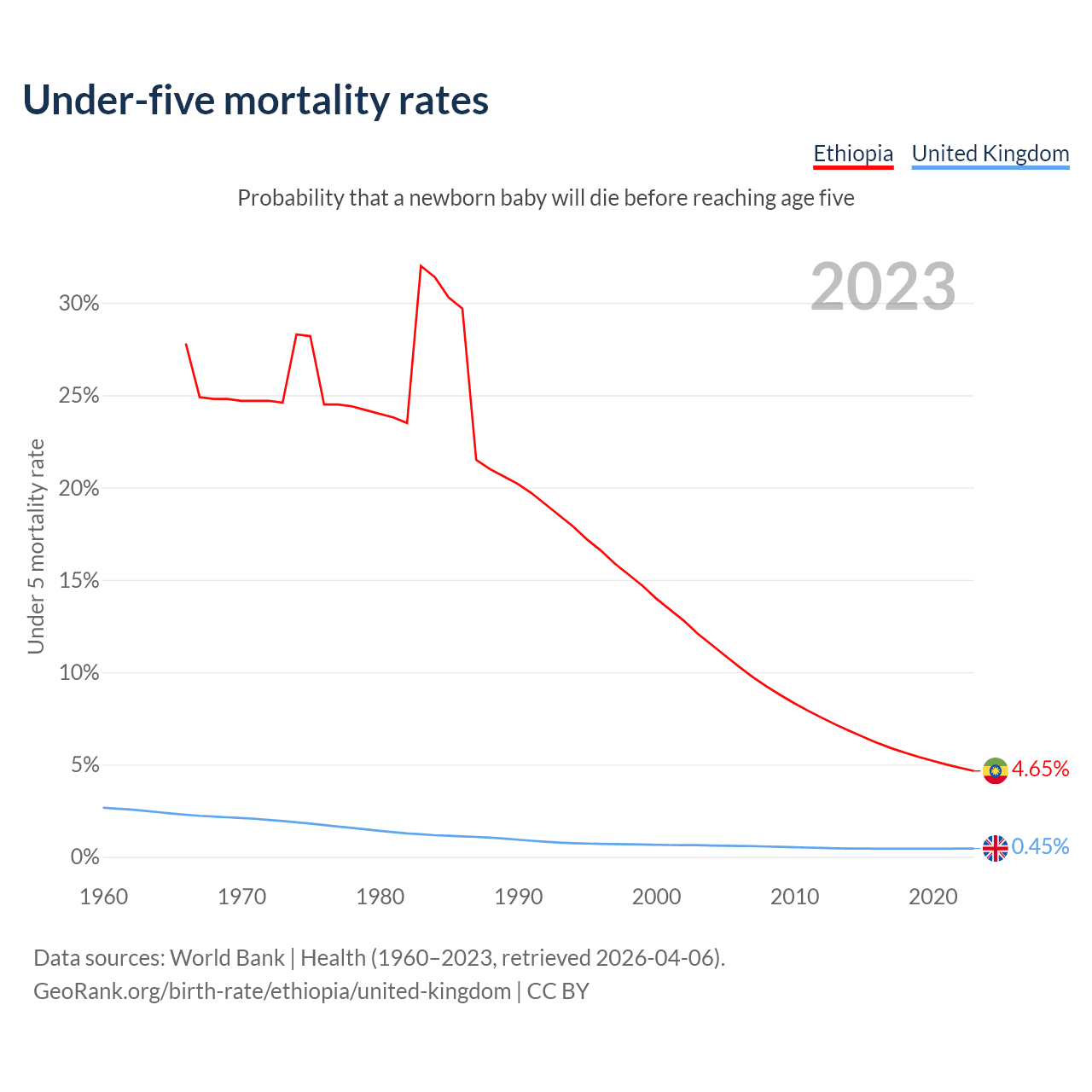The chance that a newborn baby will die before reaching age five is 4.65% in Ethiopia and 0.45% in the United Kingdom. Above is a chart with historical data on under-five mortality rates.