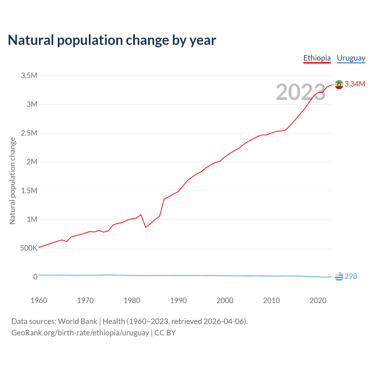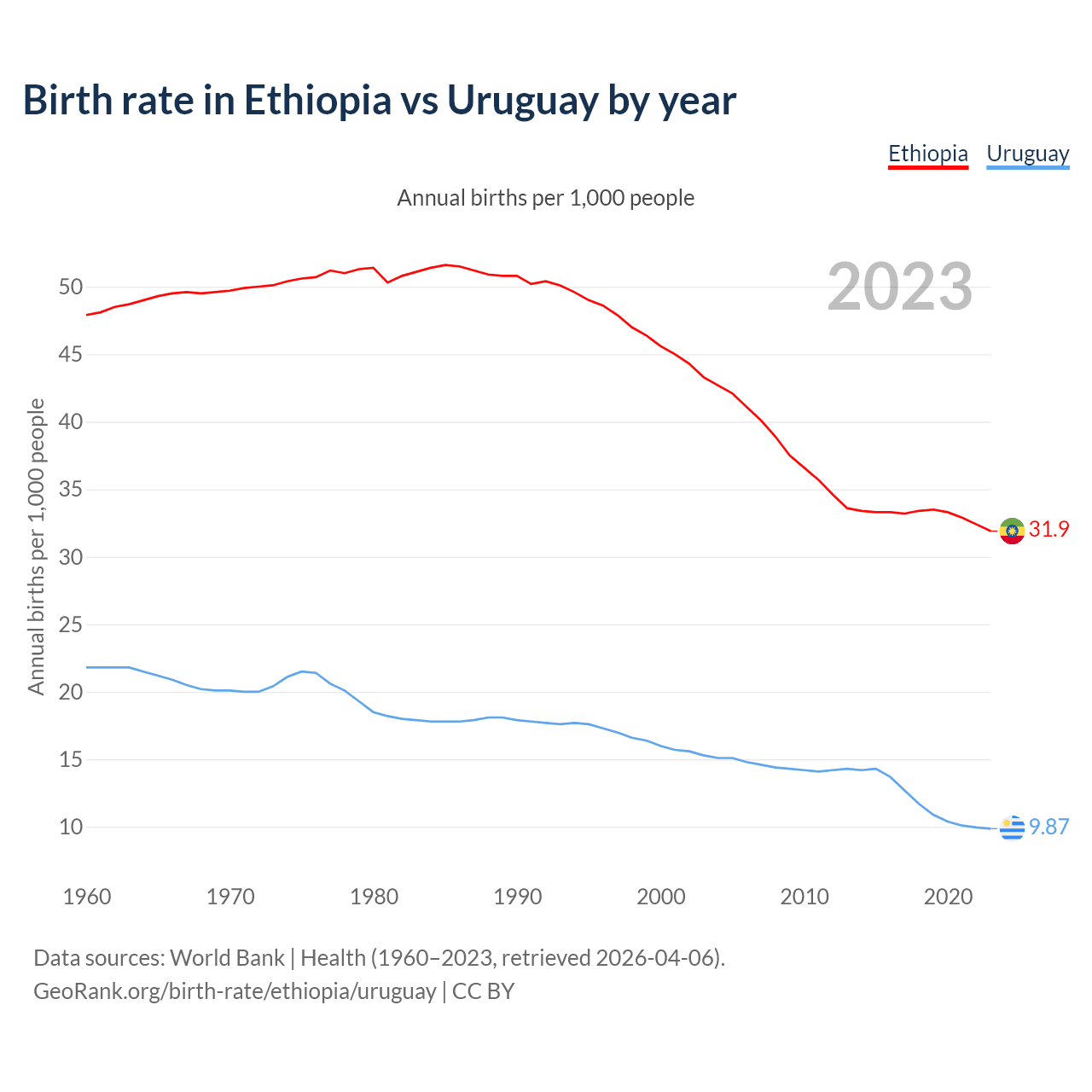 Ethiopia has an annual birth rate of 31.9 births per 1,000 people, compared to 9.87 for Uruguay. The average number of children a woman is expected to have during her lifetime — the fertility rate, is 3.99 in Ethiopia and 1.41 in Uruguay — 64.7% difference.