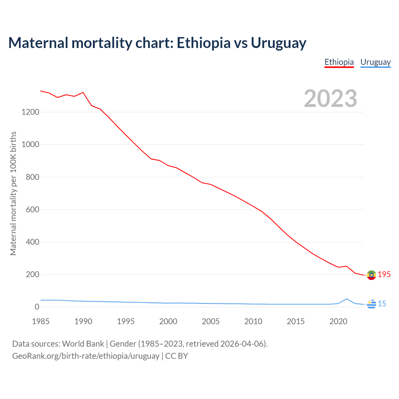 The maternal mortality rate, which is the probability of dying during childbirth or within 42 days of pregnancy termination, is 195 deaths per 100,000 live births in Ethiopia, compared to 15 deaths in Uruguay.
