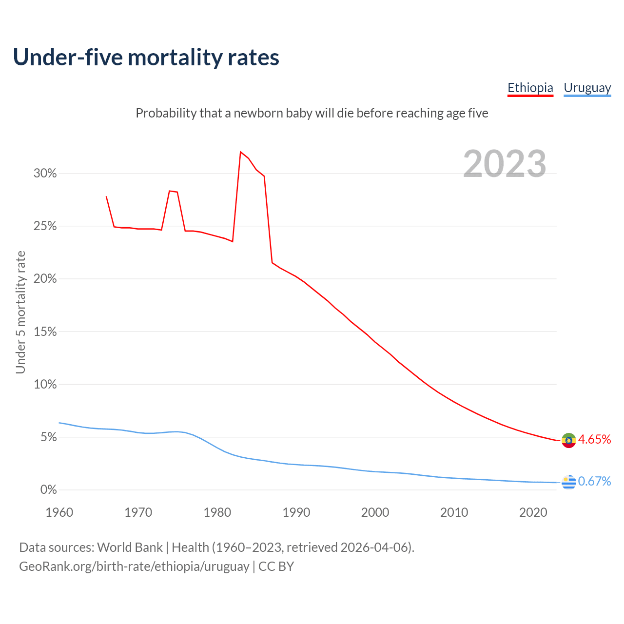 The chance that a newborn baby will die before reaching age five is 4.65% in Ethiopia and 0.67% in Uruguay. Above is a chart with historical data on under-five mortality rates.