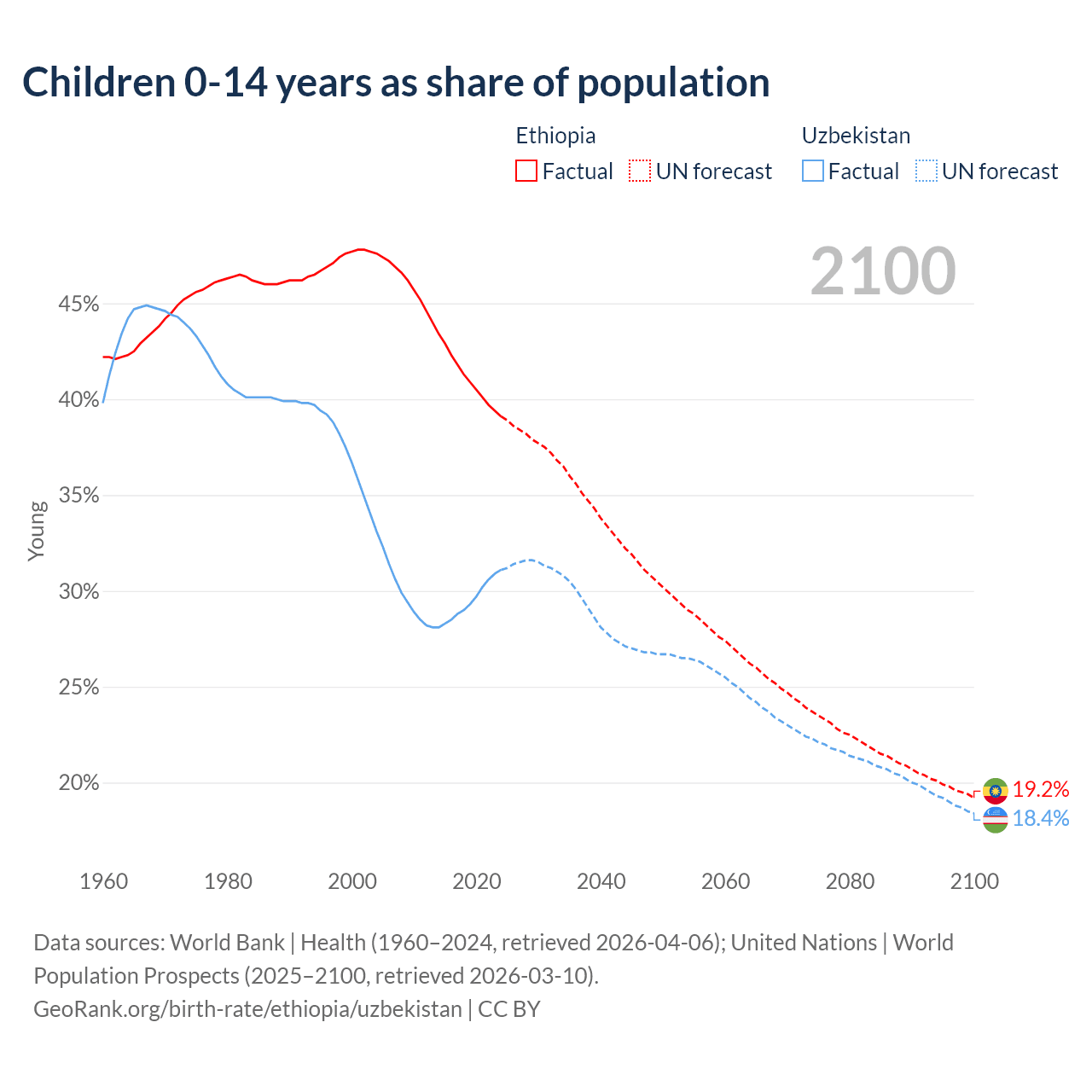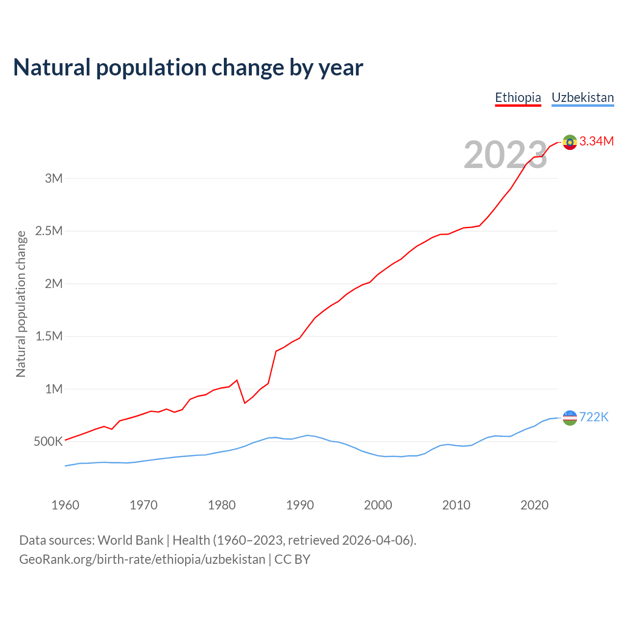 According to the latest available data on birth rates, the fertility rate in Ethiopia was 3.99 children per woman in 2023, compared to 3.5 in Uzbekistan in 2023. The replacement level is considered to be 2.1 children per woman.
