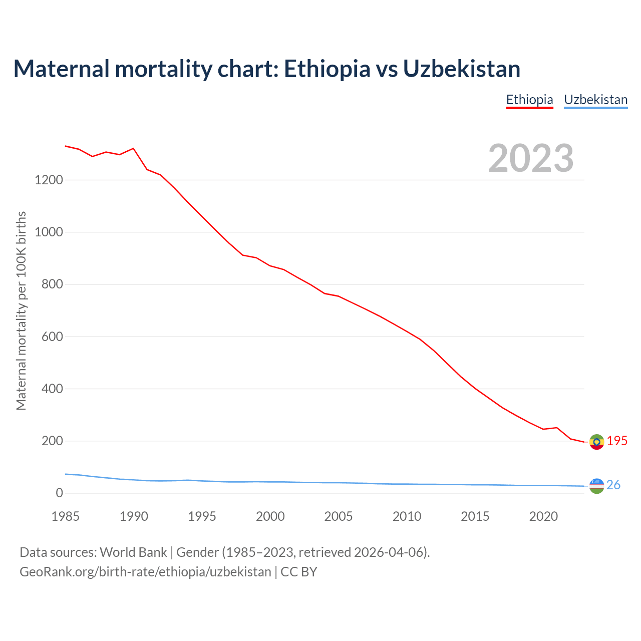 The maternal mortality rate, which is the probability of dying during childbirth or within 42 days of pregnancy termination, is 195 deaths per 100,000 live births in Ethiopia, compared to 26 deaths in Uzbekistan.