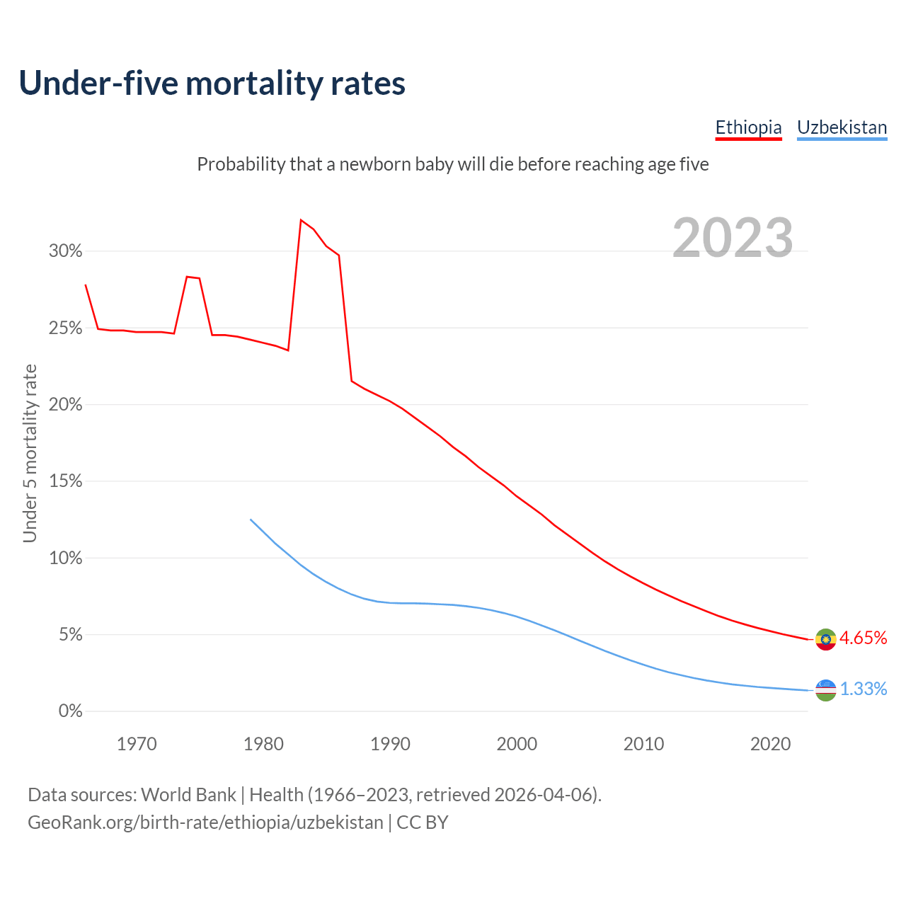 The chance that a newborn baby will die before reaching age five is 4.65% in Ethiopia and 1.33% in Uzbekistan. Above is a chart with historical data on under-five mortality rates.
