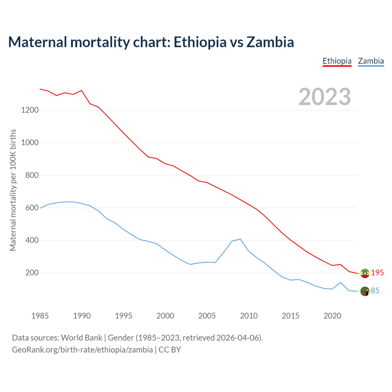 The maternal mortality rate, which is the probability of dying during childbirth or within 42 days of pregnancy termination, is 195 deaths per 100,000 live births in Ethiopia, compared to 85 deaths in Zambia.